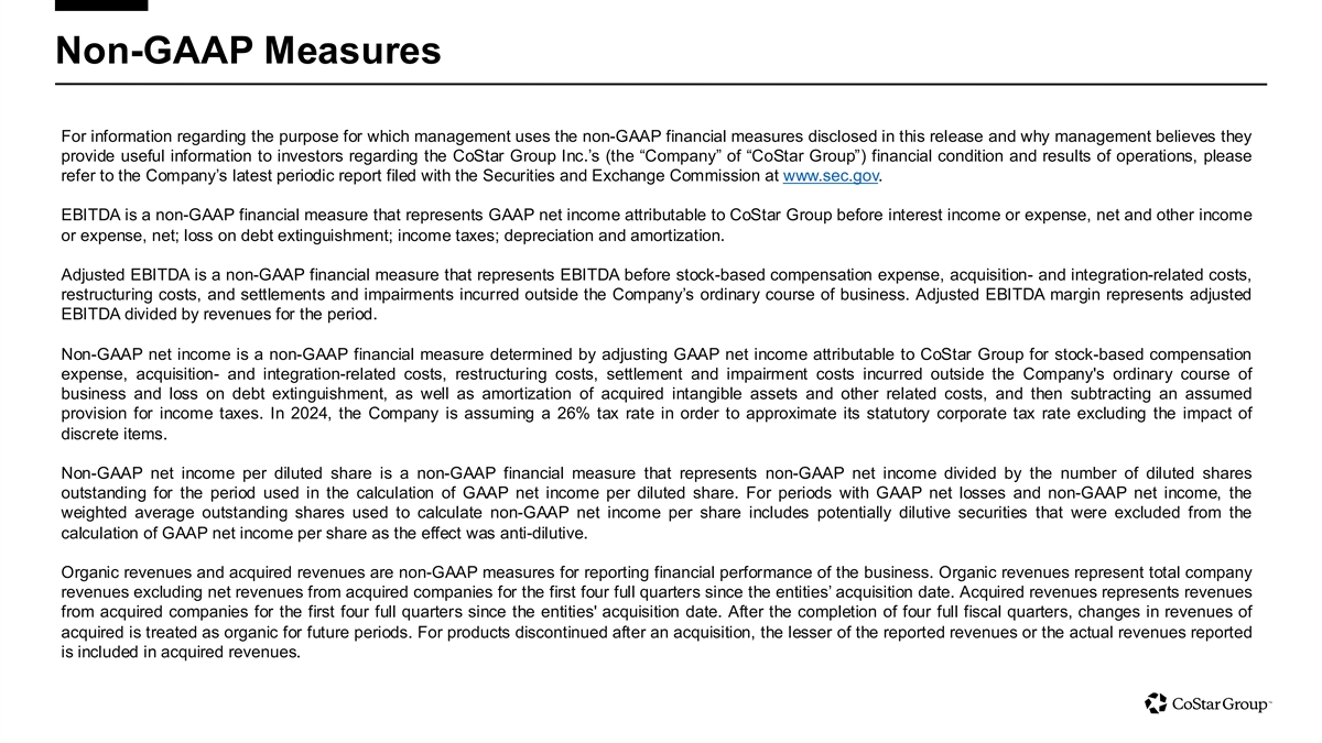 Non-GAAP Measures For information regarding the purpose for which management uses the non-GAAP financial measures disclosed in this release and why management believes they provide useful information to investors regarding the CoStar Group Inc.’s (the “Company” of “CoStar Group”) financial condition and results of operations, please refer to the Company’s latest periodic report filed with the Securities and Exchange Commission at www.sec.gov. EBITDA is a non-GAAP financial measure that represents GAAP net income attributable to CoStar Group before interest income or expense, net and other income or expense, net; loss on debt extinguishment; income taxes; depreciation and amortization. Adjusted EBITDA is a non-GAAP financial measure that represents EBITDA before stock-based compensation expense, acquisition- and integration-related costs, restructuring costs, and settlements and impairments incurred outside the Company’s ordinary course of business. Adjusted EBITDA margin represents adjusted EBITDA divided by revenues for the period. Non-GAAP net income is a non-GAAP financial measure determined by adjusting GAAP net income attributable to CoStar Group for stock-based compensation expense, acquisition- and integration-related costs, restructuring costs, settlement and impairment costs incurred outside the Company's ordinary course of business and loss on debt extinguishment, as well as amortization of acquired intangible assets and other related costs, and then subtracting an assumed provision for income taxes. In 2024, the Company is assuming a 26% tax rate in order to approximate its statutory corporate tax rate excluding the impact of discrete items. Non-GAAP net income per diluted share is a non-GAAP financial measure that represents non-GAAP net income divided by the number of diluted shares outstanding for the period used in the calculation of GAAP net income per diluted share. For periods with GAAP net losses and non-GAAP net income, the weighted average outstanding shares used to calculate non-GAAP net income per share includes potentially dilutive securities that were excluded from the calculation of GAAP net income per share as the effect was anti-dilutive. Organic revenues and acquired revenues are non-GAAP measures for reporting financial performance of the business. Organic revenues represent total company revenues excluding net revenues from acquired companies for the first four full quarters since the entities’ acquisition date. Acquired revenues represents revenues from acquired companies for the first four full quarters since the entities' acquisition date. After the completion of four full fiscal quarters, changes in revenues of acquired is treated as organic for future periods. For products discontinued after an acquisition, the lesser of the reported revenues or the actual revenues reported is included in acquired revenues.