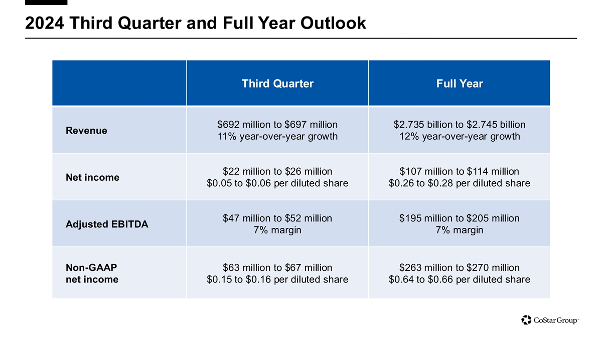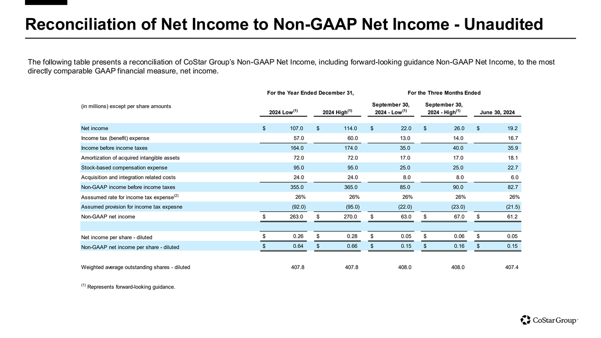 Reconciliation of Net Income to Non-GAAP Net Income - Unaudited The following table presents a reconciliation of CoStar Group’s Non-GAAP Net Income, including forward-looking guidance Non-GAAP Net Income, to the most directly comparable GAAP financial measure, net income. For the Year Ended December 31, For the Three Months Ended September 30, September 30, (in millions) except per share amounts (1) (1) (1) (1) 2024 Low 2024 High 2024 - Low 2024 - High June 30, 2024 Net income $ 107.0 $ 114.0 $ 22.0 $ 26.0 $ 19.2 Income tax (benefit) expense 57.0 60.0 13.0 14.0 16.7 Income before income taxes 164.0 174.0 35.0 40.0 35.9 Amortization of acquired intangible assets 72.0 72.0 17.0 17.0 18.1 Stock-based compensation expense 95.0 95.0 25.0 25.0 22.7 Acquisition and integration related costs 24.0 24.0 8.0 8.0 6.0 Non-GAAP income before income taxes 355.0 365.0 85.0 90.0 82.7 (2) Asssumed rate for income tax expense 26% 26% 26% 26% 26% Assumed provision for income tax expesne (92.0) (95.0) (22.0) (23.0) (21.5) Non-GAAP net income $ 263.0 $ 270.0 $ 63.0 $ 67.0 $ 61.2 $ 0.26 $ 0.28 $ 0.05 $ 0.06 $ 0.05 Net income per share - diluted $ 0.64 $ 0.66 $ 0.15 $ 0.16 $ 0.15 Non-GAAP net income per share - diluted Weighted average outstanding shares - diluted 407.8 407.8 4 08.0 408.0 407.4 (1) Represents forward-looking guidance.