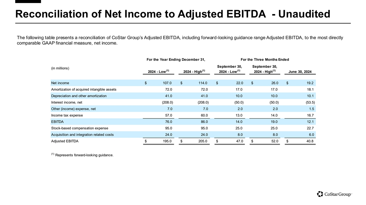 Reconciliation of Net Income to Adjusted EBITDA - Unaudited The following table presents a reconciliation of CoStar Group’s Adjusted EBITDA, including forward-looking guidance range Adjusted EBITDA, to the most directly comparable GAAP financial measure, net income. For the Year Ending December 31, For the Three Months Ended September 30, September 30, (in millions) (1) (1) (1) (1) 2024 - Low 2024 - High 2024 - Low 2024 - High June 30, 2024 Net income $ 107.0 $ 114.0 $ 22.0 $ 26.0 $ 19.2 Amortization of acquired intangible assets 72.0 72.0 17.0 17.0 18.1 Depreciation and other amortization 41.0 41.0 10.0 10.0 10.1 Interest income, net (208.0) (208.0) (50.0) (50.0) (53.5) Other (income) expense, net 7.0 7.0 2.0 2.0 1.5 Income tax expense 57.0 60.0 13.0 14.0 16.7 EBITDA 76.0 86.0 14.0 19.0 12.1 Stock-based compensation expense 95.0 95.0 25.0 25.0 22.7 Acquisition and integration related costs 24.0 24.0 8.0 8.0 6.0 Adjusted EBITDA $ 195.0 $ 205.0 $ 47.0 $ 52.0 $ 40.8 (1) Represents forward-looking guidance.