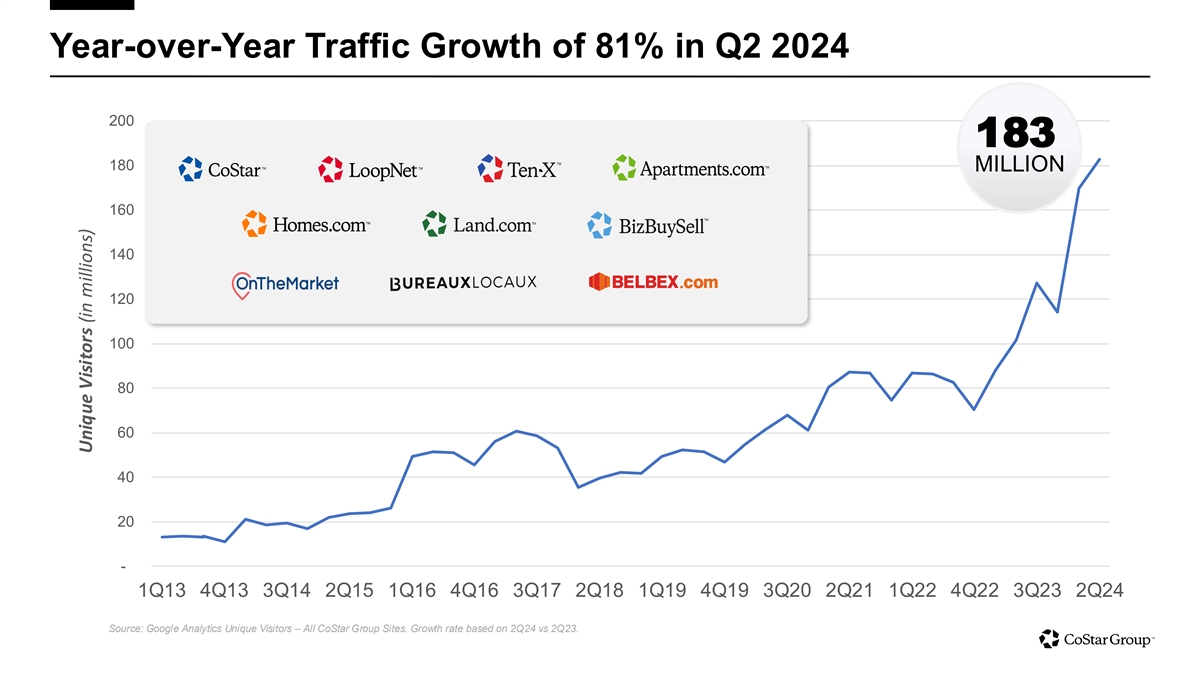 Year-over-Year Traffic Growth of 81% in Q2 2024 200 183 180 MILLION 160 140 120 100 80 60 40 20 - 1Q13 4Q13 3Q14 2Q15 1Q16 4Q16 3Q17 2Q18 1Q19 4Q19 3Q20 2Q21 1Q22 4Q22 3Q23 2Q24 Source: Google Analytics Unique Visitors – All CoStar Group Sites. Growth rate based on 2Q24 vs 2Q23. Unique Visitors (in millions)