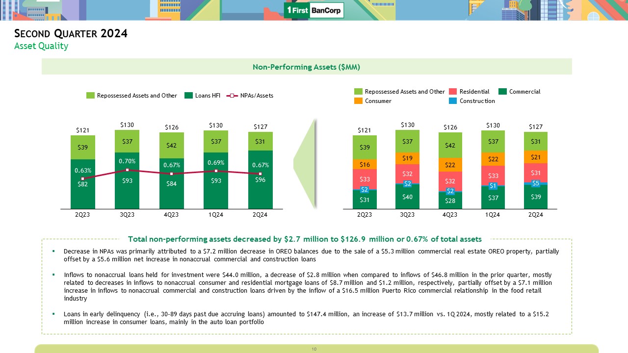 Second Quarter 2024  Profitability Dynamics  Non-Interest Expenses ($MM)  Non-interest expenses of $118.7 million, down $2.2 million vs. prior quarter; expenses for the second and first quarters of 2024 included an additional FDIC special assessment expense of $0.2 million and $0.9 million, respectively  Excluding the effect of the FDIC expense, adjusted non-interest expenses decreased by $1.5 million mainly due to:   A $2.0 million decrease in payroll expenses due to lower payroll taxes, stock-based compensation expense of retirement-eligible employees recorded during 1Q 2024, and a $2.3 million gain on the sale of a commercial real estate property in Puerto Rico during 2Q 2024  Partially offset by a $1.9 million increase in card processing expenses, mainly due to $1.3 million in card expense reimbursements recognized during 1Q 2024  Efficiency ratio was 51.2% compared to 52.5% in the prior quarter   Key Highlights  Non-Interest Income ($MM)  Key Highlights  Non-interest income of $32.0 million, compared to $34.0 million in prior quarter; the $2.0 million decrease includes:  A $2.7 million decrease in insurance commission income driven by the seasonal contingent commission of $3.2 million recorded in 1Q 2024 based on the prior year’s production of insurance policies  Partially offset by a $0.5 million increase in mortgage banking activities due to an increase in the net realized gain on sales of residential mortgage loans in the secondary market related to higher volume of sales and a $0.2 million net increase in the fair value of derivatives   -20  0  60  80  100  120  140  -$0.8  $59.4  2Q23  -$1.2  $61.3  2Q24  $61.5  -$0.1  $118.7  4Q23  $63.7  -$2.5  $71.1  $112.9  $116.6  -$0.1  $126.6  1Q24  3Q23  $120.9  Credit Related  Payroll Related  Other Operating Expenses  $2.9  2Q23  $2.8  3Q23  $2.1  4Q23  $2.9  1Q24  $36.3  $30.3  $33.6  $34.0  2Q24  $32.0  Other  Mortgage Banking  Service Charges on Deposits  9