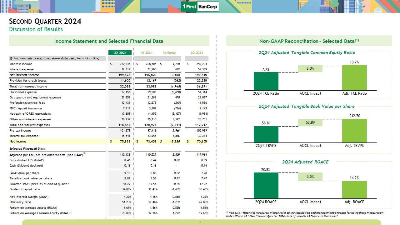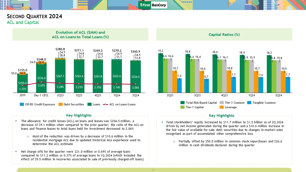 Second Quarter 2024  ACL and Capital  Total stockholders’ equity increased by $11.7 million to $1.5 billion as of 2Q 2024 driven by net income generated during the quarter and a $10.6 million increase in the fair value of available-for-sale debt securities due to changes in market rates recognized as part of accumulated other comprehensive loss  Partially offset by $50.0 million in common stock repurchases and $26.6 million in cash dividends declared during the quarter  Evolution of ACL ($MM) and   ACL on Loans to Total Loans (%)  Capital Ratios (%)  The allowance for credit losses (ACL) on loans and leases was $254.5 million, a decrease of $9.1 million when compared to the prior quarter; the ratio of the ACL on loans and finance leases to total loans held for investment decreased to 2.06%  Most of the reduction was driven by a decrease of $10.6 million in the residential mortgage ACL due to updated historical loss experience used to determine the ACL estimate  Net charge offs for the quarter were $21.0 million or 0.69% of average loans compared to $11.2 million or 0.37% of average loans in 1Q 2024 (which included the effect of $9.5 million in recoveries associated to sale of previously charged-off loans)  Key Highlights  Key Highlights  $0.0  1.72%  2019  $8.0  2.61%  Day-1 CECL  $0.0  2.28%  2Q23  2.21%  1Q24  4Q23  2.15%  3Q23  2.06%  2Q24  $155.0  $248.0  2.14%  $271.1  $269.2  $270.2  $260.9  $280.8  Off-BS Credit Exposure  Debt Securities  Loans  ACL on Loans/Loans  16.6  2Q23  16.4  3Q23  16.1  1Q24  4Q23  15.8  2Q24  15.9  Total Risk-Based Capital  Tier-1 Capital  Tier-1 Common  Leverage  Tangible Common  11