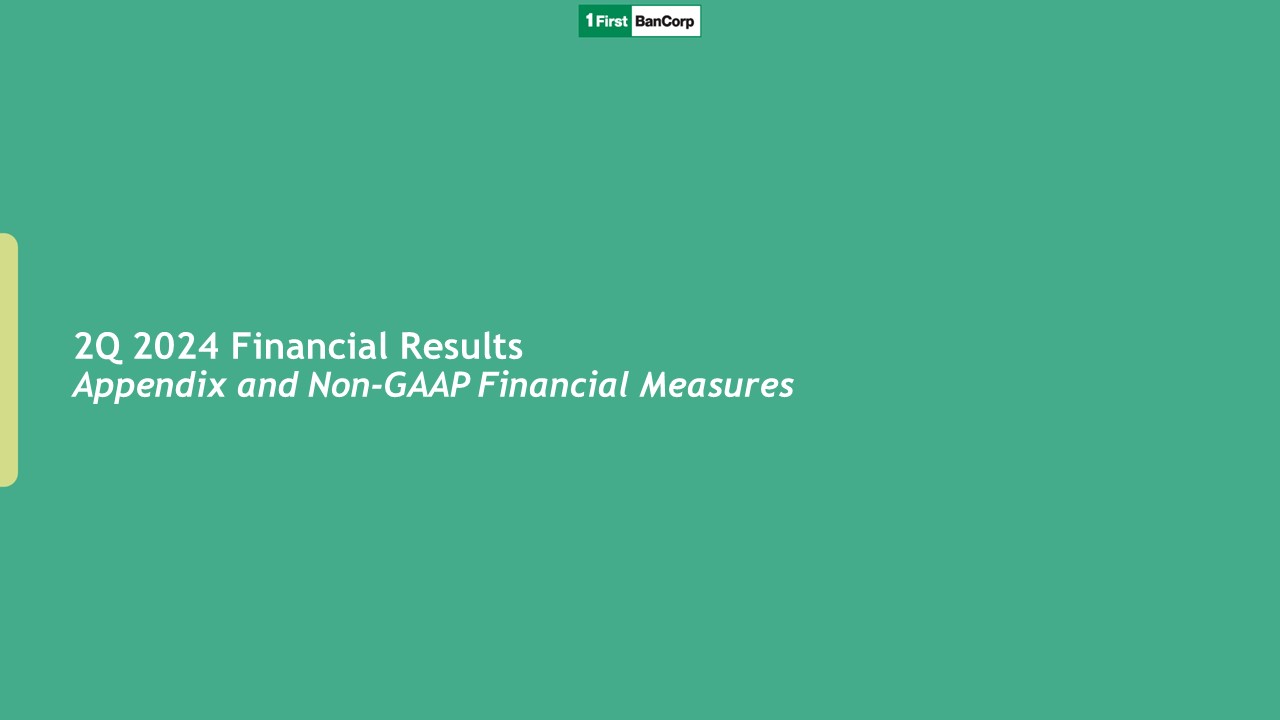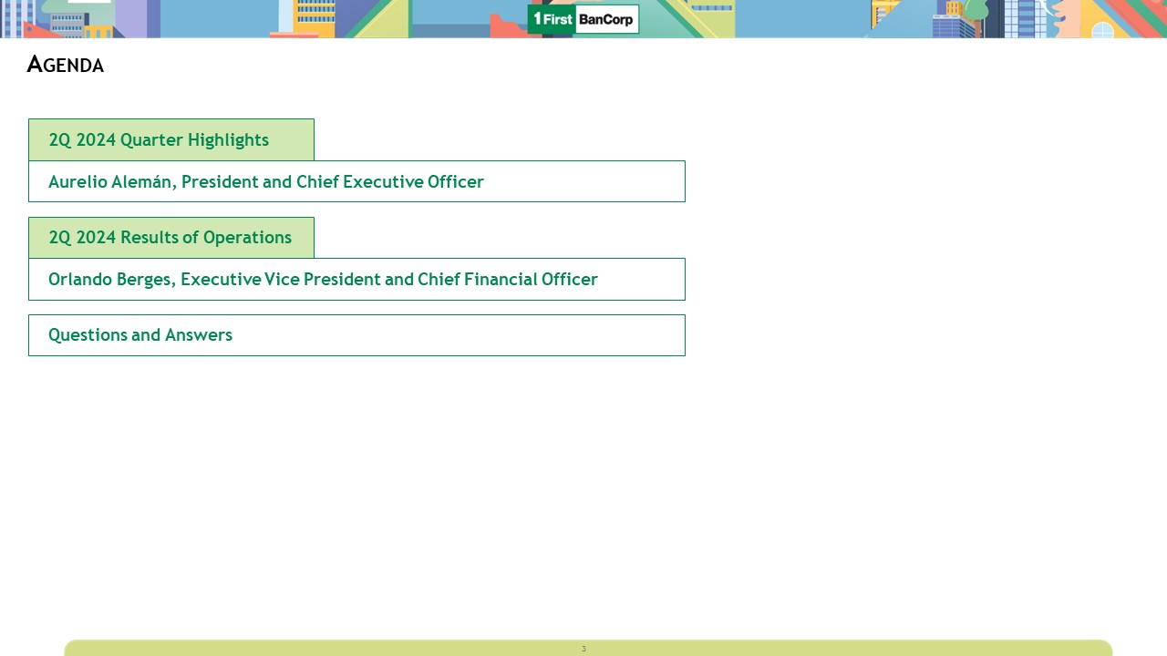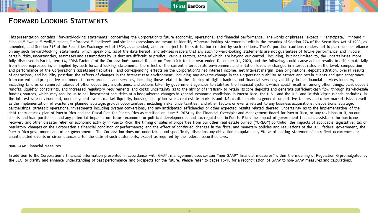 Forward Looking Statements  This presentation contains “forward-looking statements” concerning the Corporation’s future economic, operational and financial performance. The words or phrases “expect,” “anticipate,” “intend,” “should,” “would,” “will,” “plans,” “forecast,” “believe” and similar expressions are meant to identify “forward-looking statements” within the meaning of Section 27A of the Securities Act of 1933, as amended, and Section 21E of the Securities Exchange Act of 1934, as amended, and are subject to the safe harbor created by such sections. The Corporation cautions readers not to place undue reliance on any such forward-looking statements, which speak only as of the date hereof, and advises readers that any such forward-looking statements are not guarantees of future performance and involve certain risks, uncertainties, estimates and assumptions by us that are difficult to predict. Various factors, some of which are beyond our control, including, but not limited to, the uncertainties more fully discussed in Part I, Item 1A, “Risk Factors” of the Corporation’s Annual Report on Form 10-K for the year ended December 31, 2023, and the following, could cause actual results to differ materially from those expressed in, or implied by, such forward-looking statements: the effect of the current interest rate environment and inflation levels or changes in interest rates on the level, composition and performance of the Corporation’s assets and liabilities, and corresponding effects on the Corporation’s net interest income, net interest margin, loan originations, deposit attrition, overall results of operations, and liquidity position; the effects of changes in the interest rate environment, including any adverse change in the Corporation’s ability to attract and retain clients and gain acceptance from current and prospective customers for new products and services, including those related to the offering of digital banking and financial services; volatility in the financial services industry, including failures or rumored failures of other depository institutions, and actions taken by government agencies to stabilize the financial system, which could result in, among other things, bank deposit runoffs, liquidity constraints, and increased regulatory requirements and costs; uncertainty as to the ability of FirstBank to retain its core deposits and generate sufficient cash flow through its wholesale funding sources, which may require us to sell investment securities at a loss; adverse changes in general economic conditions in Puerto Rico, the U.S., and the U.S. and British Virgin Islands, including in the interest rate environment, unemployment rates, market liquidity, housing absorption rates, real estate markets and U.S. capital markets; general competitive factors and other market risks as well as the implementation of existent or planned strategic growth opportunities, including risks, uncertainties, and other factors or events related to any business acquisitions, dispositions, strategic partnerships, strategic operational investments including system conversions, and any anticipated efficiencies or other expected results related thereto; uncertainty as to the implementation of the debt restructuring plan of Puerto Rico and the Fiscal Plan for Puerto Rico as certified on June 5, 2024 by the Financial Oversight and Management Board for Puerto Rico, or any revisions to it, on our clients and loan portfolios, and any potential impact from future economic or political developments and tax regulations in Puerto Rico; the impact of government financial assistance for hurricane recovery and other disaster relief on economic activity in Puerto Rico; the timing of sales of properties from our other real estate owned (“OREO”) portfolio; the impacts of applicable legislative, tax or regulatory changes on the Corporation’s financial condition or performance; and the effect of continued changes in the fiscal and monetary policies and regulations of the U.S. federal government, the Puerto Rico government and other governments. The Corporation does not undertake, and specifically disclaims any obligation to update any “forward-looking statements” to reflect occurrences or unanticipated events or circumstances after the date of such statements, except as required by the federal securities laws.  Non-GAAP Financial Measures  In addition to the Corporation’s financial information presented in accordance with GAAP, management uses certain “non-GAAP” financial measures” within the meaning of Regulation G promulgated by the SEC, to clarify and enhance understanding of past performance and prospects for the future. Please refer to pages 16-18 for a reconciliation of GAAP to non-GAAP measures and calculations.  2