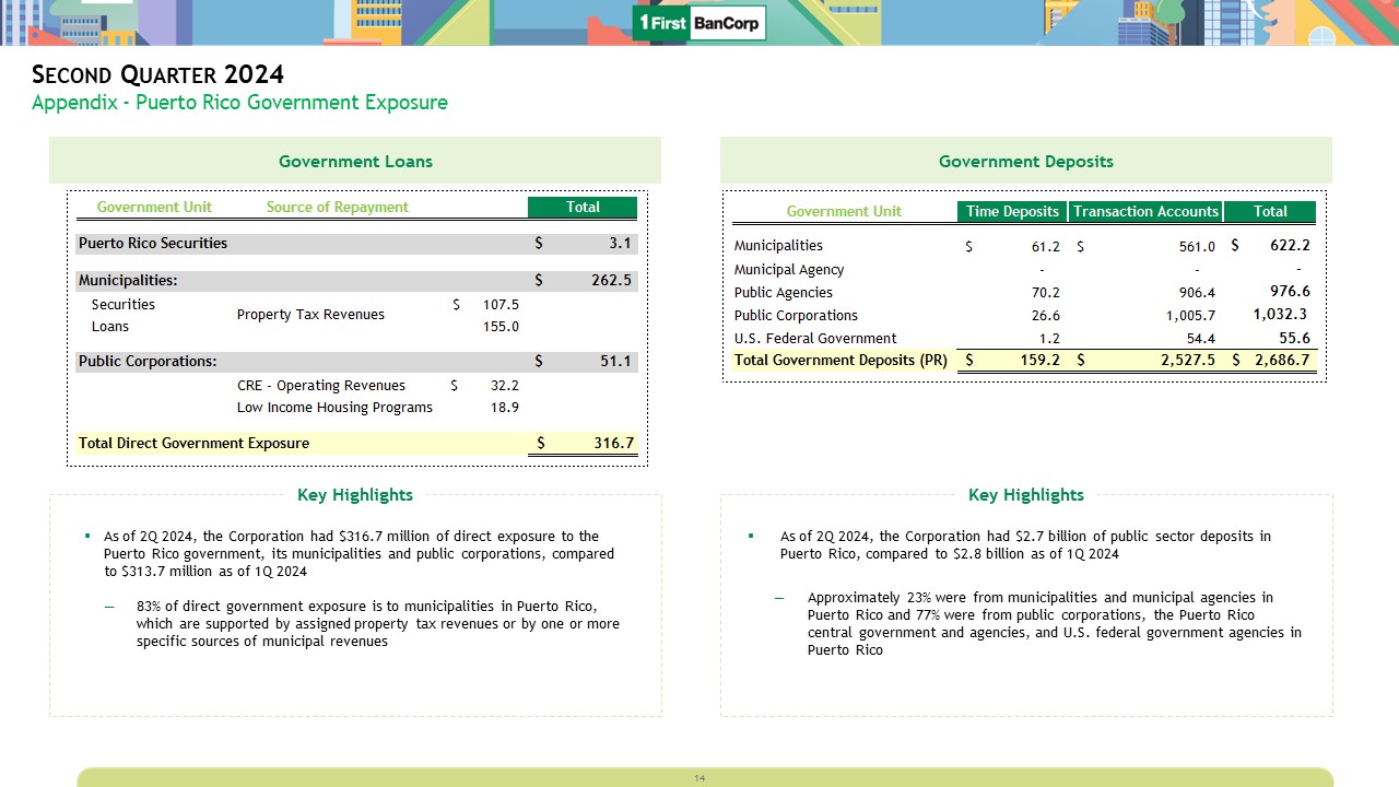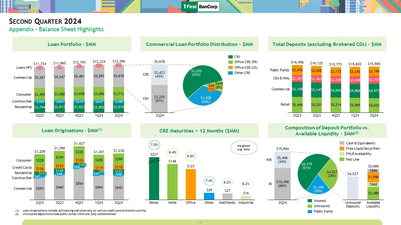 Second Quarter 2024  Appendix – Balance Sheet Highlights  Loan Portfolio - $MM  Loan Originations - $MM(1)  Total Deposits (excluding Brokered CDs) - $MM  Composition of Deposit Portfolio vs.   Available Liquidity - $MM(2)  $14  $164  2Q23  $9  $203  3Q23  $7  $215  4Q23  $12  $237  1Q24  $10  $186  2Q24  Loans HFS  Commercial  Consumer  Construction  Residential  $11,734  $11,960  $12,193  $12,324  $12,396  $115  $47  2Q23  $46  3Q23  $102  $26  4Q23  $47  1Q24  $48  2Q24  Consumer  Credit Cards  Residential  Construction  Commercial  $1,209  $1,298  $1,427  $1,201  $1,230  2Q23  3Q23  4Q23  1Q24  2Q24  Public Funds  CDs & IRAs  Commercial  Retail  $16,456  $16,125  $15,773  $15,820  $15,904  Loan Originations include refinancing and renewals, as well as credit card utilization activity  Uninsured deposits exclude public funds which are fully collateralized   $5,406(34%)  $10,498(66%)  2Q24  NIB  IB  $15,904  $8,179(51%)  $4,527(28%)  $3,198(20%)  Insured  Uninsured  Public Funds  Uninsured Deposits  Available Liquidity  $5,989  Cash & Equivalents  Free Liquid Securities  FHLB Availability  Fed Line  13  Commercial Loan Portfolio Distribution - $MM  $2,423(43%)  $3,255(57%)  2Q24  CRE  C&I  $5,678  $3,255(57%)  $439(8%)  $56(1%)  $1,928(34%)  C&I  Office CRE (PR)  Office CRE (US)  Other CRE  CRE Maturities < 12 Months ($MM)  Retail  Hotel  Office  Other  Multifamily  Industrial  $227  7.0%  6.4%  6.6%  7.4%  6.2%  8.2%  Weighted Avg. Rate