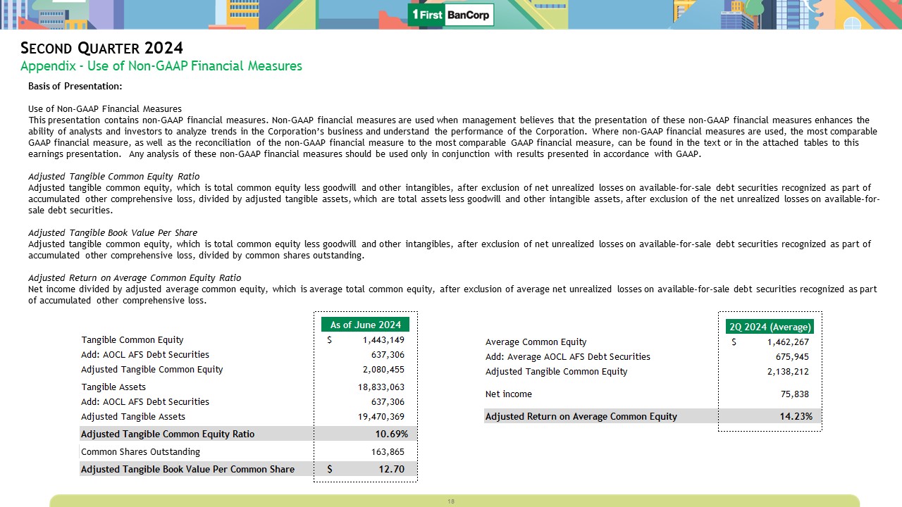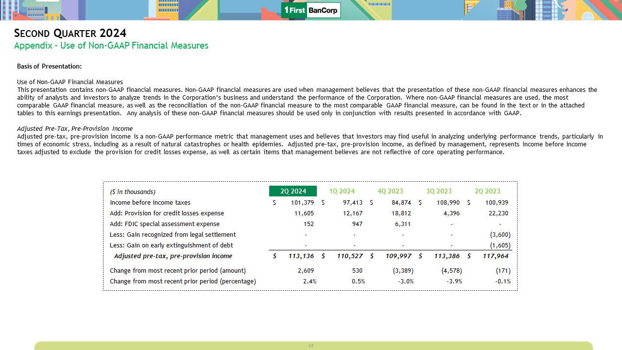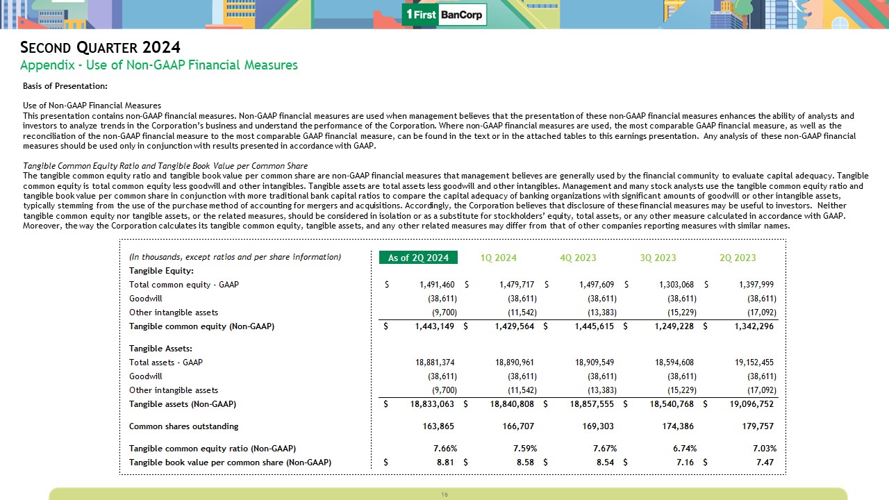 Second Quarter 2024  Appendix - Use of Non-GAAP Financial Measures  Basis of Presentation:  Use of Non-GAAP Financial Measures   This presentation contains non-GAAP financial measures. Non-GAAP financial measures are used when management believes that the presentation of these non-GAAP financial measures enhances the ability of analysts and investors to analyze trends in the Corporation’s business and understand the performance of the Corporation. Where non-GAAP financial measures are used, the most comparable GAAP financial measure, as well as the reconciliation of the non-GAAP financial measure to the most comparable GAAP financial measure, can be found in the text or in the attached tables to this earnings presentation. Any analysis of these non-GAAP financial measures should be used only in conjunction with results presented in accordance with GAAP.   Tangible Common Equity Ratio and Tangible Book Value per Common Share   The tangible common equity ratio and tangible book value per common share are non-GAAP financial measures that management believes are generally used by the financial community to evaluate capital adequacy. Tangible common equity is total common equity less goodwill and other intangibles. Tangible assets are total assets less goodwill and other intangibles. Management and many stock analysts use the tangible common equity ratio and tangible book value per common share in conjunction with more traditional bank capital ratios to compare the capital adequacy of banking organizations with significant amounts of goodwill or other intangible assets, typically stemming from the use of the purchase method of accounting for mergers and acquisitions. Accordingly, the Corporation believes that disclosure of these financial measures may be useful to investors. Neither tangible common equity nor tangible assets, or the related measures, should be considered in isolation or as a substitute for stockholders’ equity, total assets, or any other measure calculated in accordance with GAAP. Moreover, the way the Corporation calculates its tangible common equity, tangible assets, and any other related measures may differ from that of other companies reporting measures with similar names.  16