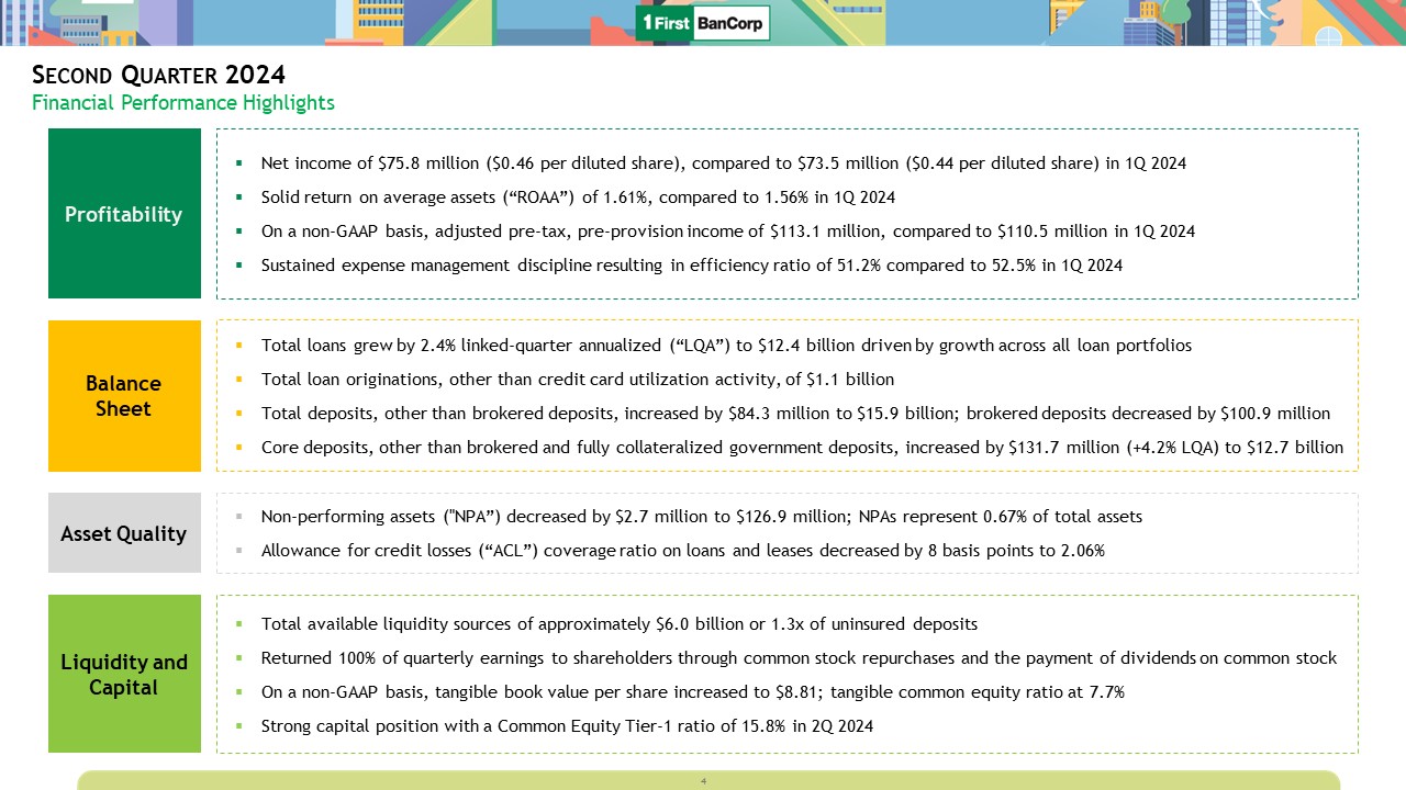 Second Quarter 2024  Financial Performance Highlights  Balance Sheet  Total loans grew by 2.4% linked-quarter annualized (“LQA”) to $12.4 billion driven by growth across all loan portfolios  Total loan originations, other than credit card utilization activity, of $1.1 billion  Total deposits, other than brokered deposits, increased by $84.3 million to $15.9 billion; brokered deposits decreased by $100.9 million  Core deposits, other than brokered and fully collateralized government deposits, increased by $131.7 million (+4.2% LQA) to $12.7 billion   Non-performing assets ("NPA”) decreased by $2.7 million to $126.9 million; NPAs represent 0.67% of total assets  Allowance for credit losses (“ACL”) coverage ratio on loans and leases decreased by 8 basis points to 2.06%  Asset Quality  Total available liquidity sources of approximately $6.0 billion or 1.3x of uninsured deposits  Returned 100% of quarterly earnings to shareholders through common stock repurchases and the payment of dividends on common stock  On a non-GAAP basis, tangible book value per share increased to $8.81; tangible common equity ratio at 7.7%   Strong capital position with a Common Equity Tier-1 ratio of 15.8% in 2Q 2024  Liquidity and Capital  Profitability  Net income of $75.8 million ($0.46 per diluted share), compared to $73.5 million ($0.44 per diluted share) in 1Q 2024  Solid return on average assets (“ROAA”) of 1.61%, compared to 1.56% in 1Q 2024  On a non-GAAP basis, adjusted pre-tax, pre-provision income of $113.1 million, compared to $110.5 million in 1Q 2024  Sustained expense management discipline resulting in efficiency ratio of 51.2% compared to 52.5% in 1Q 2024  4