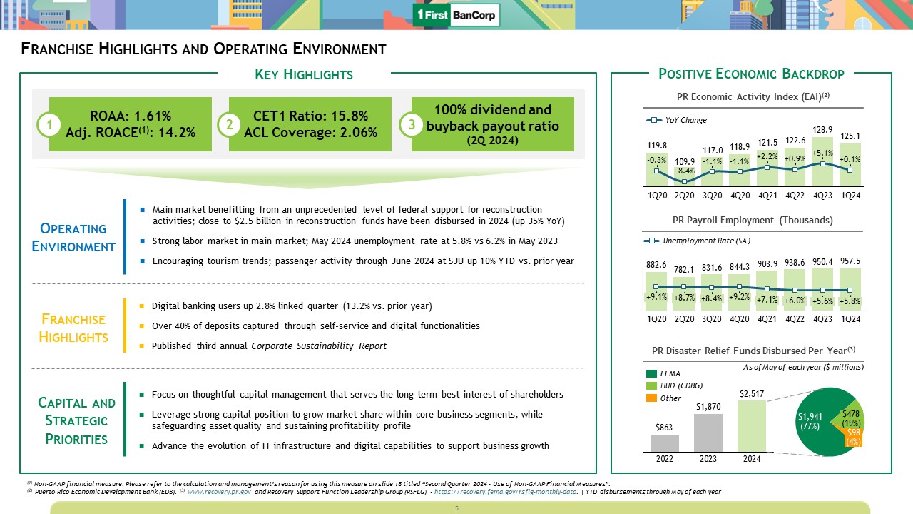 Franchise Highlights and Operating Environment  Key Highlights  ROAA: 1.61%   Adj. ROACE(1): 14.2%  1  CET1 Ratio: 15.8%  ACL Coverage: 2.06%  2  100% dividend and buyback payout ratio (2Q 2024)  3  Capital and Strategic Priorities  Operating Environment  Main market benefitting from an unprecedented level of federal support for reconstruction activities; close to $2.5 billion in reconstruction funds have been disbursed in 2024 (up 35% YoY)  Strong labor market in main market; May 2024 unemployment rate at 5.8% vs 6.2% in May 2023  Encouraging tourism trends; passenger activity through June 2024 at SJU up 10% YTD vs. prior year  Positive Economic Backdrop  PR Economic Activity Index (EAI)(2)  1Q20  -8.4%  2Q20  3Q20  4Q20  4Q21  4Q22  4Q23  1Q24  YoY Change  PR Payroll Employment (Thousands)  1Q20  2Q20  3Q20  4Q20  4Q21  4Q22  4Q23  1Q24  +9.1%  +8.7%  +8.4%  +9.2%  +7.1%  +6.0%  +5.6%  +5.8%  Unemployment Rate (SA)  2022  2023  2024  $863  $1,870  $2,517  $1,941(77%)  $478(19%)  $98(4%)  FEMA  HUD (CDBG)  Other  PR Disaster Relief Funds Disbursed Per Year(3)  Franchise Highlights  Digital banking users up 2.8% linked quarter (13.2% vs. prior year)  Over 40% of deposits captured through self-service and digital functionalities  Published third annual Corporate Sustainability Report  Focus on thoughtful capital management that serves the long-term best interest of shareholders  Leverage strong capital position to grow market share within core business segments, while safeguarding asset quality and sustaining profitability profile  Advance the evolution of IT infrastructure and digital capabilities to support business growth   (1) Non-GAAP financial measure. Please refer to the calculation and management’s reason for using this measure on slide 18 titled “Second Quarter 2024 - Use of Non-GAAP Financial Measures”.  (2) Puerto Rico Economic Development Bank (EDB). (3) www.recovery.pr.gov and Recovery Support Function Leadership Group (RSFLG) - https://recovery.fema.gov/rsflg-monthly-data. | YTD disbursements through May of each year  5  As of May of each year ($ millions)