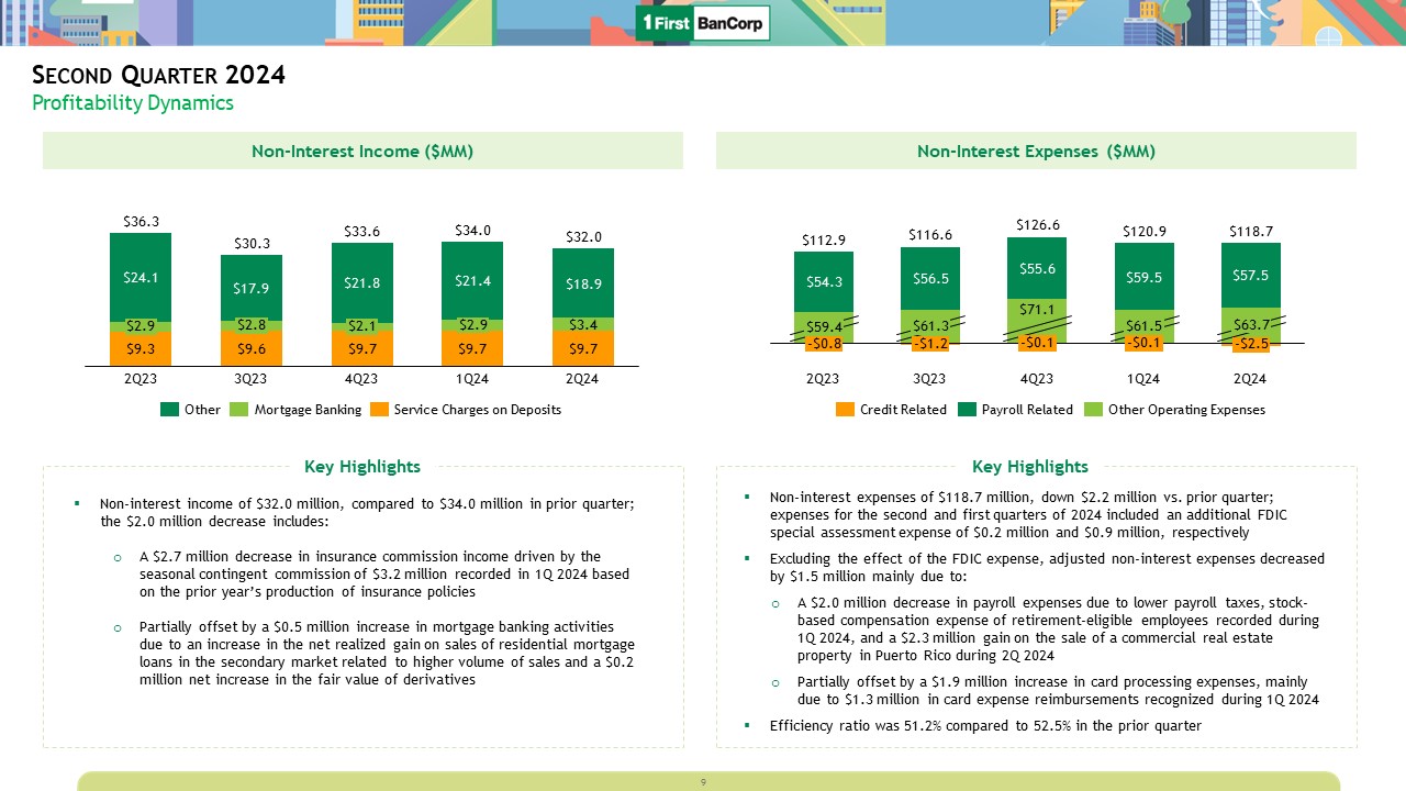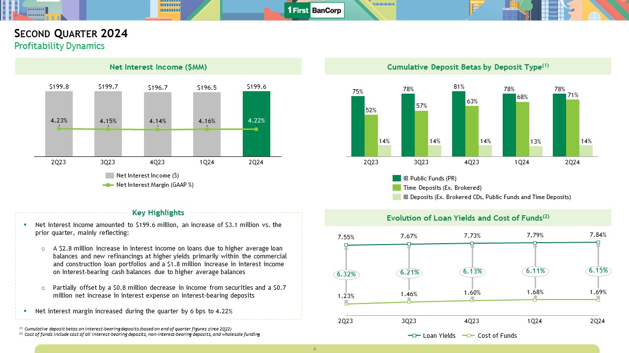 Second Quarter 2024  Profitability Dynamics  Net Interest Income ($MM)  4.23%  2Q23  4.15%  3Q23  4.14%  4Q23  4.16%  1Q24  4.22%  2Q24  Net Interest Income ($)  Net Interest Margin (GAAP %)  Net interest income amounted to $199.6 million, an increase of $3.1 million vs. the prior quarter, mainly reflecting:   A $2.8 million increase in interest income on loans due to higher average loan balances and new refinancings at higher yields primarily within the commercial and construction loan portfolios and a $1.8 million increase in interest income on interest-bearing cash balances due to higher average balances  Partially offset by a $0.8 million decrease in income from securities and a $0.7 million net increase in interest expense on interest-bearing deposits  Net interest margin increased during the quarter by 6 bps to 4.22%  Key Highlights  Cumulative Deposit Betas by Deposit Type(1)  2Q23  3Q23  4Q23  1Q24  2Q24  Evolution of Loan Yields and Cost of Funds(2)  (1) Cumulative deposit betas on interest-bearing deposits (based on end of quarter figures since 2Q22)  (2) Cost of funds include cost of all interest-bearing deposits, non-interest-bearing deposits, and wholesale funding  IB Public Funds (PR)  Time Deposits (Ex. Brokered)  IB Deposits (Ex. Brokered CDs, Public Funds and Time Deposits)  2Q23  3Q23  4Q23  1Q24  2Q24  6.21%  6.32%  6.13%  6.11%  6.15%  Loan Yields  Cost of Funds  8