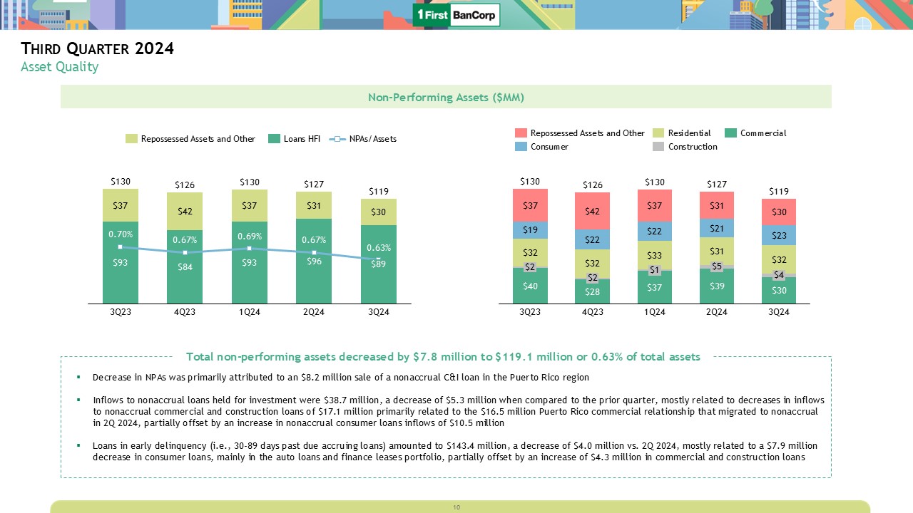 Third Quarter 2024  Profitability Dynamics  Non-Interest Expenses ($MM)  Non-interest expenses of $122.9 million, up $4.2 million vs. prior quarter mainly due to:  A $2.3 million decrease in net gain on OREO operations driven by a $2.3 million gain on sale of a commercial REO in 2Q 2024   A $1.6 million increase in payroll expenses due to annual salary merit increases and an additional working day  Efficiency ratio was 52.4% compared to 51.2% in the prior quarter   Key Highlights  Non-Interest Income ($MM)  Key Highlights  Non-interest income of $32.5 million, compared to $32.0 million in prior quarter; the $0.5 million increase includes:  $0.8 million in proceeds received in 3Q 2024 from an insurance claim  Partially offset by a $0.2 million decrease in revenues from mortgage banking activities due to lower volume of sales of mortgage loans in the secondary market  -20  0  80  100  120  140  -$1.2  $61.3  3Q23  -$0.1  $71.1  4Q23  2Q24  $63.7  $118.7  -$2.5  $122.9  3Q24  1Q24  $64.5  $116.6  $61.5  -$0.7  $126.6  -$0.1  $120.9  Credit Related  Payroll Related  Other Operating Expenses  $2.8  3Q23  $2.1  4Q23  1Q24  2Q24  3Q24  $30.3  $33.6  $34.0  $32.0  $32.5  Other  Mortgage Banking  Service Charges on Deposits  9