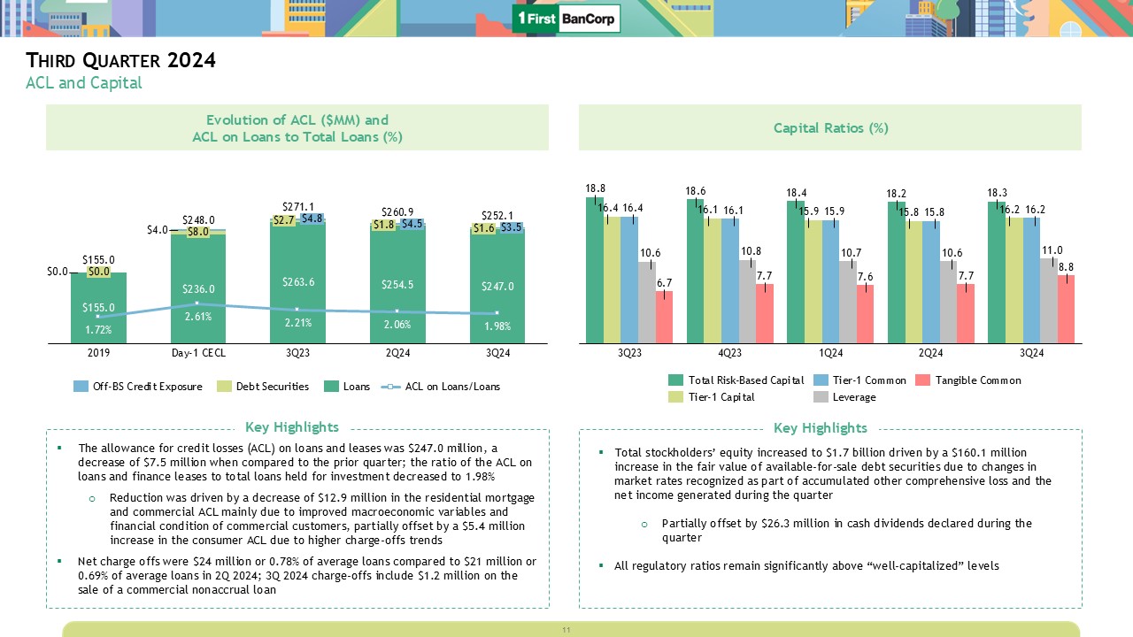 Third Quarter 2024  ACL and Capital  Total stockholders’ equity increased to $1.7 billion driven by a $160.1 million increase in the fair value of available-for-sale debt securities due to changes in market rates recognized as part of accumulated other comprehensive loss and the net income generated during the quarter  Partially offset by $26.3 million in cash dividends declared during the quarter  All regulatory ratios remain significantly above “well-capitalized” levels  Evolution of ACL ($MM) and   ACL on Loans to Total Loans (%)  Capital Ratios (%)  The allowance for credit losses (ACL) on loans and leases was $247.0 million, a decrease of $7.5 million when compared to the prior quarter; the ratio of the ACL on loans and finance leases to total loans held for investment decreased to 1.98%  Reduction was driven by a decrease of $12.9 million in the residential mortgage and commercial ACL mainly due to improved macroeconomic variables and financial condition of commercial customers, partially offset by a $5.4 million increase in the consumer ACL due to higher charge-offs trends  Net charge offs were $24 million or 0.78% of average loans compared to $21 million or 0.69% of average loans in 2Q 2024; 3Q 2024 charge-offs include $1.2 million on the sale of a commercial nonaccrual loan  Key Highlights  Key Highlights  $0.0  $0.0  1.72%  2019  $8.0  2.61%  Day-1 CECL  $4.8  $2.7  2.21%  3Q23  $4.5  $1.8  2.06%  2Q24  $3.5  $1.6  1.98%  3Q24  $155.0  $248.0  $271.1  $260.9  $252.1  Off-BS Credit Exposure  Debt Securities  Loans  ACL on Loans/Loans  16.4  3Q23  16.1  4Q23  15.9  15.8  2Q24  1Q24  16.2  3Q24  Total Risk-Based Capital  Tier-1 Capital  Tier-1 Common  Leverage  Tangible Common  11