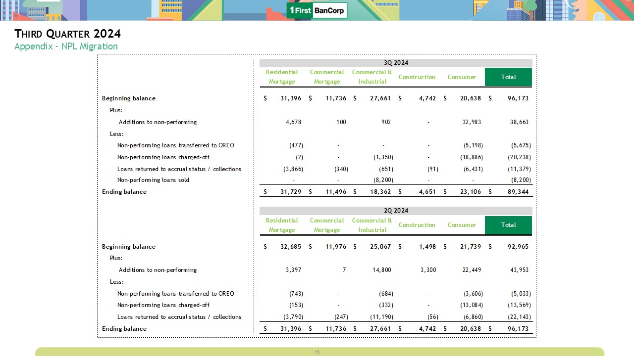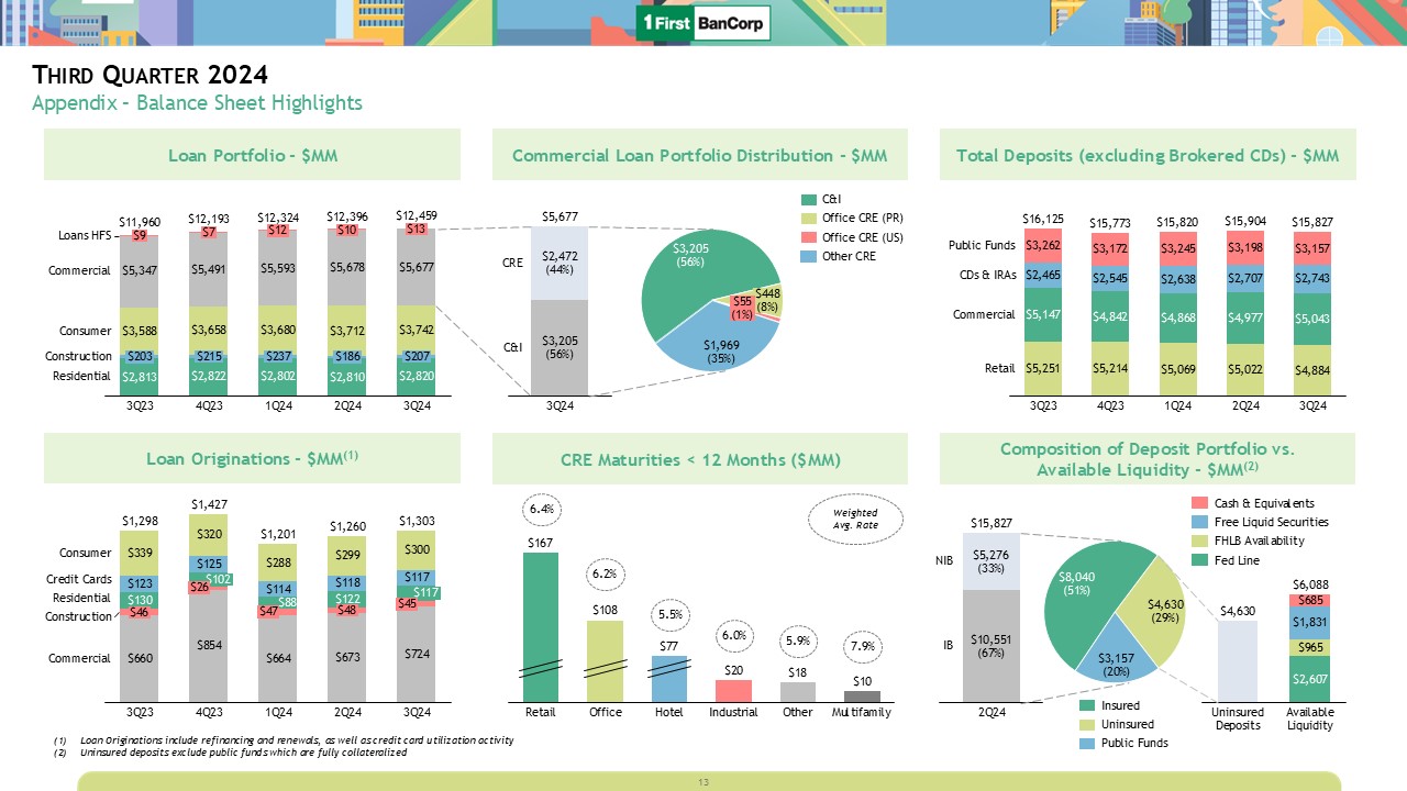 Third Quarter 2024  Appendix – Balance Sheet Highlights  Loan Portfolio - $MM  Loan Originations - $MM(1)  Total Deposits (excluding Brokered CDs) - $MM  Composition of Deposit Portfolio vs.   Available Liquidity - $MM(2)  $9  $203  3Q23  $7  $215  4Q23  $12  $237  1Q24  $10  $186  2Q24  $13  $207  3Q24  Loans HFS  Commercial  Consumer  Construction  Residential  $11,960  $12,193  $12,324  $12,396  $12,459  $46  3Q23  $102  $26  4Q23  $47  1Q24  $48  2Q24  $117  $45  3Q24  Consumer  Credit Cards  Residential  Construction  Commercial  $1,298  $1,427  $1,201  $1,260  $1,303  3Q23  4Q23  1Q24  2Q24  3Q24  Public Funds  CDs & IRAs  Commercial  Retail  $16,125  $15,773  $15,820  $15,904  $15,827  Loan Originations include refinancing and renewals, as well as credit card utilization activity  Uninsured deposits exclude public funds which are fully collateralized   $5,276(33%)  $10,551(67%)  2Q24  NIB  IB  $15,827  $8,040(51%)  $4,630(29%)  $3,157(20%)  Insured  Uninsured  Public Funds  Uninsured Deposits  Available Liquidity  $6,088  Cash & Equivalents  Free Liquid Securities  FHLB Availability  Fed Line  13  Commercial Loan Portfolio Distribution - $MM  $2,472(44%)  $3,205(56%)  3Q24  CRE  C&I  $5,677  $3,205(56%)  $448(8%)  $55(1%)  $1,969(35%)  C&I  Office CRE (PR)  Office CRE (US)  Other CRE  CRE Maturities < 12 Months ($MM)  Retail  Office  Hotel  Industrial  Other  Multifamily  $167  $108  $77  6.4%  6.2%  5.5%  6.0%  5.9%  7.9%  Weighted Avg. Rate