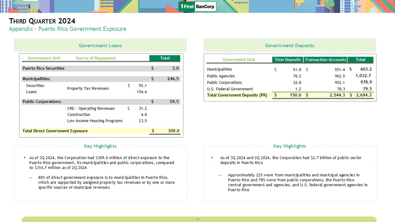 Third Quarter 2024  Appendix - Puerto Rico Government Exposure  Government Loans  Key Highlights  Government Deposits  Key Highlights  As of 3Q 2024, the Corporation had $309.0 million of direct exposure to the Puerto Rico government, its municipalities and public corporations, compared to $316.7 million as of 2Q 2024  80% of direct government exposure is to municipalities in Puerto Rico, which are supported by assigned property tax revenues or by one or more specific sources of municipal revenues  As of 3Q 2024 and 2Q 2024, the Corporation had $2.7 billion of public sector deposits in Puerto Rico  Approximately 22% were from municipalities and municipal agencies in Puerto Rico and 78% were from public corporations, the Puerto Rico central government and agencies, and U.S. federal government agencies in Puerto Rico  14