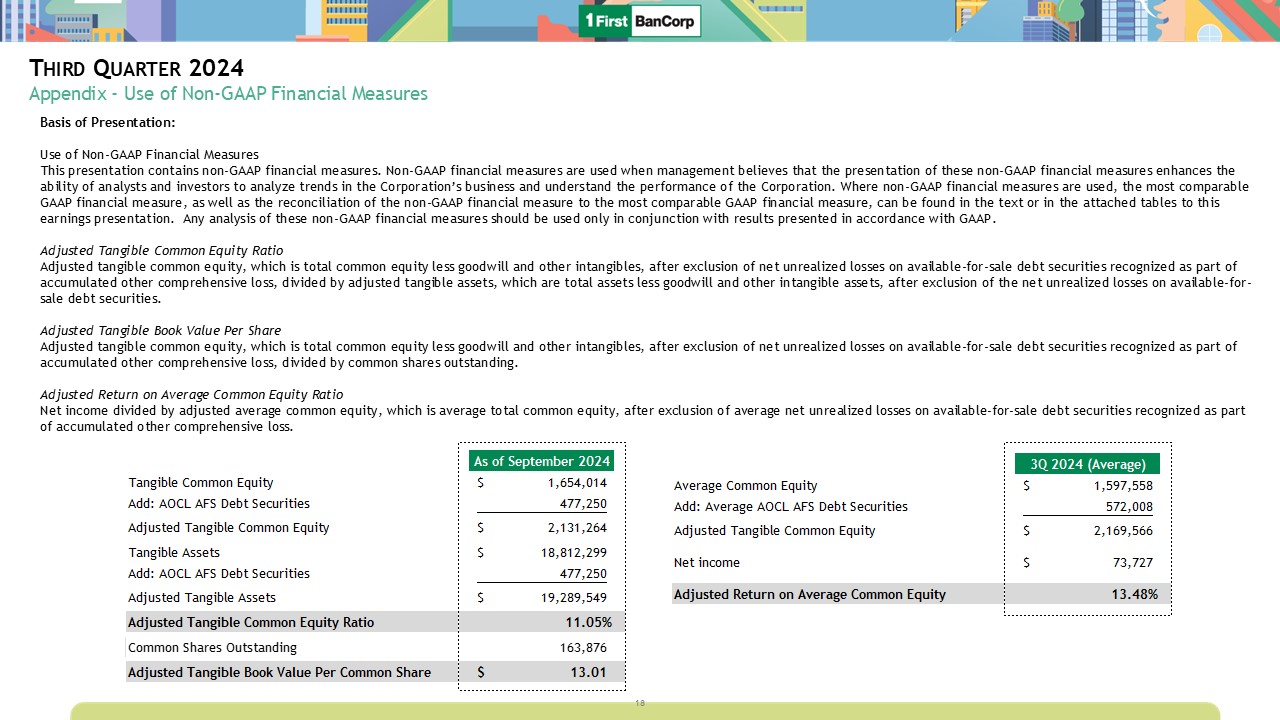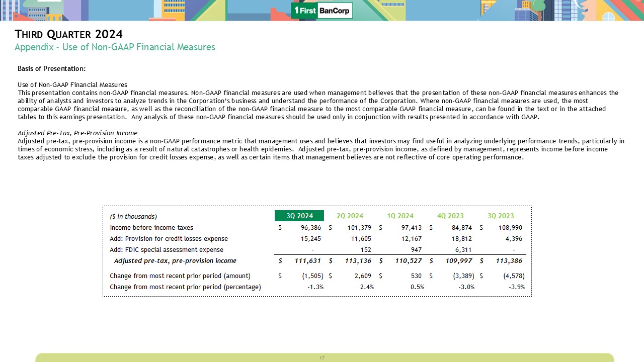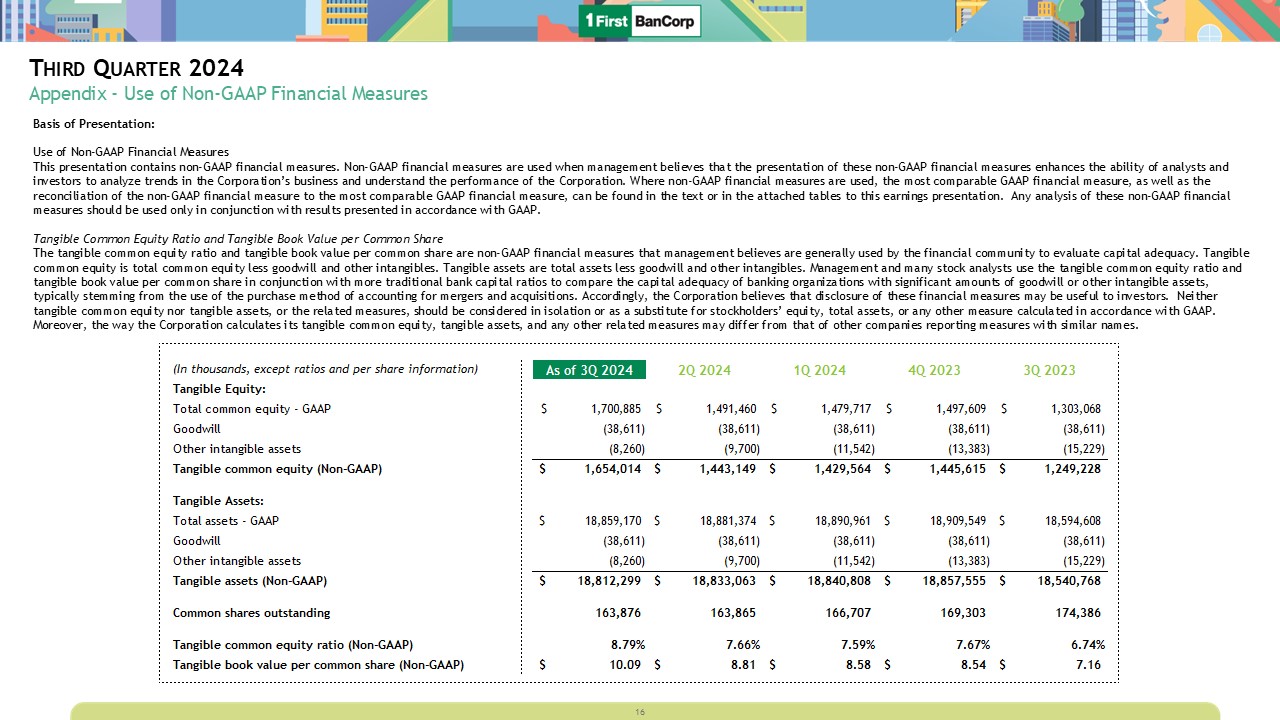 Third Quarter 2024  Appendix - Use of Non-GAAP Financial Measures  Basis of Presentation:  Use of Non-GAAP Financial Measures   This presentation contains non-GAAP financial measures. Non-GAAP financial measures are used when management believes that the presentation of these non-GAAP financial measures enhances the ability of analysts and investors to analyze trends in the Corporation’s business and understand the performance of the Corporation. Where non-GAAP financial measures are used, the most comparable GAAP financial measure, as well as the reconciliation of the non-GAAP financial measure to the most comparable GAAP financial measure, can be found in the text or in the attached tables to this earnings presentation. Any analysis of these non-GAAP financial measures should be used only in conjunction with results presented in accordance with GAAP.   Tangible Common Equity Ratio and Tangible Book Value per Common Share   The tangible common equity ratio and tangible book value per common share are non-GAAP financial measures that management believes are generally used by the financial community to evaluate capital adequacy. Tangible common equity is total common equity less goodwill and other intangibles. Tangible assets are total assets less goodwill and other intangibles. Management and many stock analysts use the tangible common equity ratio and tangible book value per common share in conjunction with more traditional bank capital ratios to compare the capital adequacy of banking organizations with significant amounts of goodwill or other intangible assets, typically stemming from the use of the purchase method of accounting for mergers and acquisitions. Accordingly, the Corporation believes that disclosure of these financial measures may be useful to investors. Neither tangible common equity nor tangible assets, or the related measures, should be considered in isolation or as a substitute for stockholders’ equity, total assets, or any other measure calculated in accordance with GAAP. Moreover, the way the Corporation calculates its tangible common equity, tangible assets, and any other related measures may differ from that of other companies reporting measures with similar names.  16