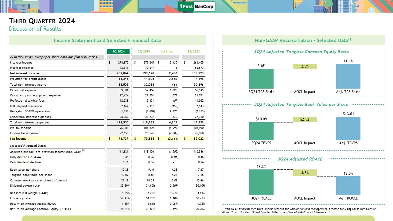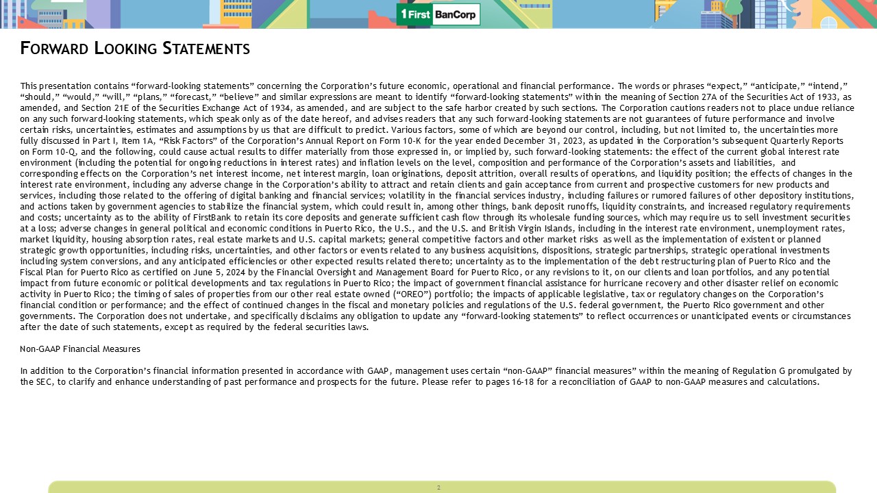 Forward Looking Statements  This presentation contains “forward-looking statements” concerning the Corporation’s future economic, operational and financial performance. The words or phrases “expect,” “anticipate,” “intend,” “should,” “would,” “will,” “plans,” “forecast,” “believe” and similar expressions are meant to identify “forward-looking statements” within the meaning of Section 27A of the Securities Act of 1933, as amended, and Section 21E of the Securities Exchange Act of 1934, as amended, and are subject to the safe harbor created by such sections. The Corporation cautions readers not to place undue reliance on any such forward-looking statements, which speak only as of the date hereof, and advises readers that any such forward-looking statements are not guarantees of future performance and involve certain risks, uncertainties, estimates and assumptions by us that are difficult to predict. Various factors, some of which are beyond our control, including, but not limited to, the uncertainties more fully discussed in Part I, Item 1A, “Risk Factors” of the Corporation’s Annual Report on Form 10-K for the year ended December 31, 2023, as updated in the Corporation’s subsequent Quarterly Reports on Form 10-Q, and the following, could cause actual results to differ materially from those expressed in, or implied by, such forward-looking statements: the effect of the current global interest rate environment (including the potential for ongoing reductions in interest rates) and inflation levels on the level, composition and performance of the Corporation’s assets and liabilities, and corresponding effects on the Corporation’s net interest income, net interest margin, loan originations, deposit attrition, overall results of operations, and liquidity position; the effects of changes in the interest rate environment, including any adverse change in the Corporation’s ability to attract and retain clients and gain acceptance from current and prospective customers for new products and services, including those related to the offering of digital banking and financial services; volatility in the financial services industry, including failures or rumored failures of other depository institutions, and actions taken by government agencies to stabilize the financial system, which could result in, among other things, bank deposit runoffs, liquidity constraints, and increased regulatory requirements and costs; uncertainty as to the ability of FirstBank to retain its core deposits and generate sufficient cash flow through its wholesale funding sources, which may require us to sell investment securities at a loss; adverse changes in general political and economic conditions in Puerto Rico, the U.S., and the U.S. and British Virgin Islands, including in the interest rate environment, unemployment rates, market liquidity, housing absorption rates, real estate markets and U.S. capital markets; general competitive factors and other market risks as well as the implementation of existent or planned strategic growth opportunities, including risks, uncertainties, and other factors or events related to any business acquisitions, dispositions, strategic partnerships, strategic operational investments including system conversions, and any anticipated efficiencies or other expected results related thereto; uncertainty as to the implementation of the debt restructuring plan of Puerto Rico and the Fiscal Plan for Puerto Rico as certified on June 5, 2024 by the Financial Oversight and Management Board for Puerto Rico, or any revisions to it, on our clients and loan portfolios, and any potential impact from future economic or political developments and tax regulations in Puerto Rico; the impact of government financial assistance for hurricane recovery and other disaster relief on economic activity in Puerto Rico; the timing of sales of properties from our other real estate owned (“OREO”) portfolio; the impacts of applicable legislative, tax or regulatory changes on the Corporation’s financial condition or performance; and the effect of continued changes in the fiscal and monetary policies and regulations of the U.S. federal government, the Puerto Rico government and other governments. The Corporation does not undertake, and specifically disclaims any obligation to update any “forward-looking statements” to reflect occurrences or unanticipated events or circumstances after the date of such statements, except as required by the federal securities laws.  Non-GAAP Financial Measures  In addition to the Corporation’s financial information presented in accordance with GAAP, management uses certain “non-GAAP” financial measures” within the meaning of Regulation G promulgated by the SEC, to clarify and enhance understanding of past performance and prospects for the future. Please refer to pages 16-18 for a reconciliation of GAAP to non-GAAP measures and calculations.  2