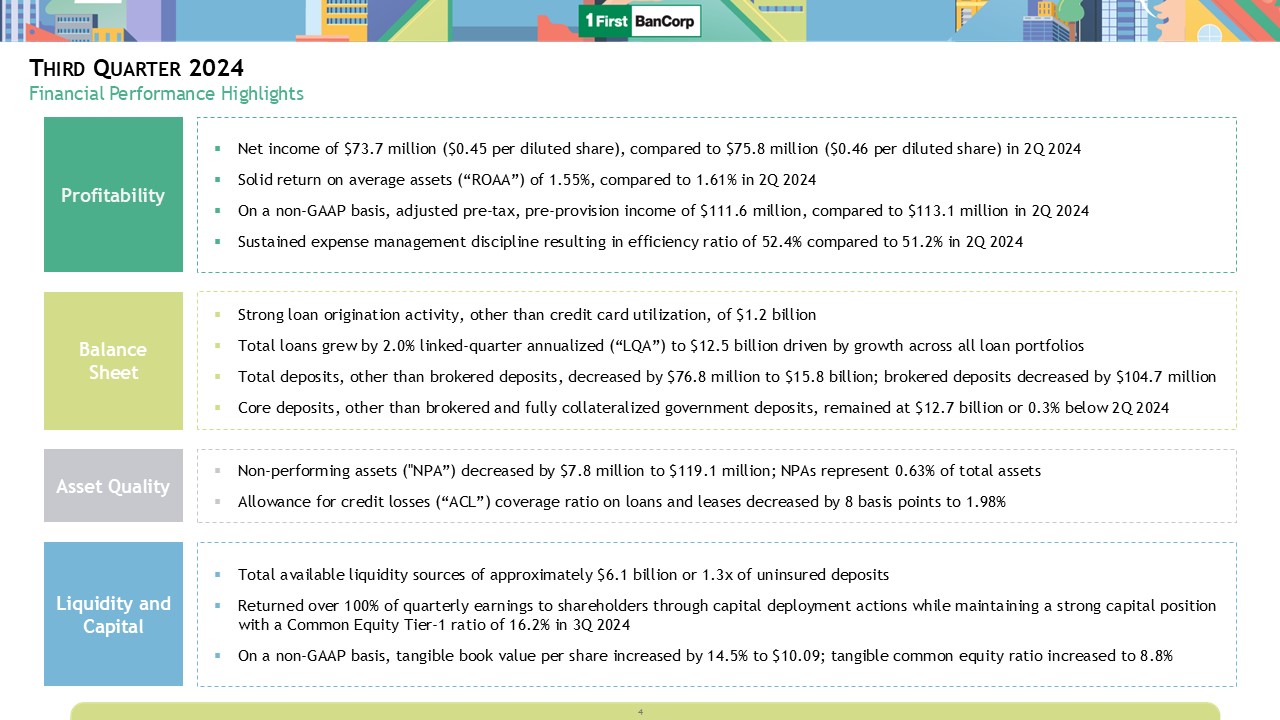 Third Quarter 2024  Financial Performance Highlights  Balance Sheet  Strong loan origination activity, other than credit card utilization, of $1.2 billion  Total loans grew by 2.0% linked-quarter annualized (“LQA”) to $12.5 billion driven by growth across all loan portfolios  Total deposits, other than brokered deposits, decreased by $76.8 million to $15.8 billion; brokered deposits decreased by $104.7 million  Core deposits, other than brokered and fully collateralized government deposits, remained at $12.7 billion or 0.3% below 2Q 2024   Non-performing assets ("NPA”) decreased by $7.8 million to $119.1 million; NPAs represent 0.63% of total assets  Allowance for credit losses (“ACL”) coverage ratio on loans and leases decreased by 8 basis points to 1.98%  Asset Quality  Total available liquidity sources of approximately $6.1 billion or 1.3x of uninsured deposits  Returned over 100% of quarterly earnings to shareholders through capital deployment actions while maintaining a strong capital position with a Common Equity Tier-1 ratio of 16.2% in 3Q 2024  On a non-GAAP basis, tangible book value per share increased by 14.5% to $10.09; tangible common equity ratio increased to 8.8%   Liquidity and Capital  Profitability  Net income of $73.7 million ($0.45 per diluted share), compared to $75.8 million ($0.46 per diluted share) in 2Q 2024  Solid return on average assets (“ROAA”) of 1.55%, compared to 1.61% in 2Q 2024  On a non-GAAP basis, adjusted pre-tax, pre-provision income of $111.6 million, compared to $113.1 million in 2Q 2024  Sustained expense management discipline resulting in efficiency ratio of 52.4% compared to 51.2% in 2Q 2024  4
