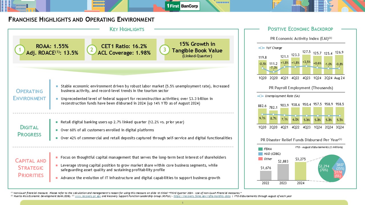 Franchise Highlights and Operating Environment  Key Highlights  ROAA: 1.55%   Adj. ROACE(1): 13.5%  1  CET1 Ratio: 16.2%  ACL Coverage: 1.98%  2  15% Growth in  Tangible Book Value (Linked-Quarter)  3  Capital and Strategic Priorities  Operating Environment  Stable economic environment driven by robust labor market (5.5% unemployment rate), increased business activity, and record-level trends in the tourism sector  Unprecedented level of federal support for reconstruction activities; over $3.3 billion in reconstruction funds have been disbursed in 2024 (up 14% YTD as of August 2024)  Positive Economic Backdrop  PR Economic Activity Index (EAI)(2)  1Q20  2Q20  4Q21  4Q22  4Q23  1Q24  2Q24  Aug 24  YoY Change  PR Payroll Employment (Thousands)  1Q20  2Q20  4Q21  4Q22  4Q23  1Q24  2Q24  3Q24  Unemployment Rate (SA)  2022  2023  2024  $1,676  $2,883  $3,275  $2,294(70%)  $807(25%)  $174(5%)  FEMA  HUD (CDBG)  Other  PR Disaster Relief Funds Disbursed Per Year(3)  Digital Progress  Retail digital banking users up 2.7% linked quarter (12.2% vs. prior year)  Over 60% of all customers enrolled in digital platforms  Over 42% of commercial and retail deposits captured through self-service and digital functionalities  Focus on thoughtful capital management that serves the long-term best interest of shareholders  Leverage strong capital position to grow market share within core business segments, while safeguarding asset quality and sustaining profitability profile  Advance the evolution of IT infrastructure and digital capabilities to support business growth   (1) Non-GAAP financial measure. Please refer to the calculation and management’s reason for using this measure on slide 18 titled “Third Quarter 2024 - Use of Non-GAAP Financial Measures.”  (2) Puerto Rico Economic Development Bank (EDB). (3) www.recovery.pr.gov and Recovery Support Function Leadership Group (RSFLG) - https://recovery.fema.gov/rsflg-monthly-data. | YTD disbursements through August of each year  5  YTD - August disbursements ($ millions)