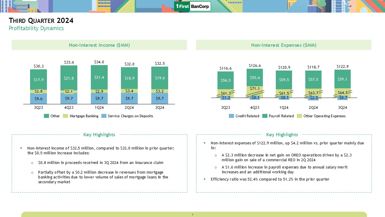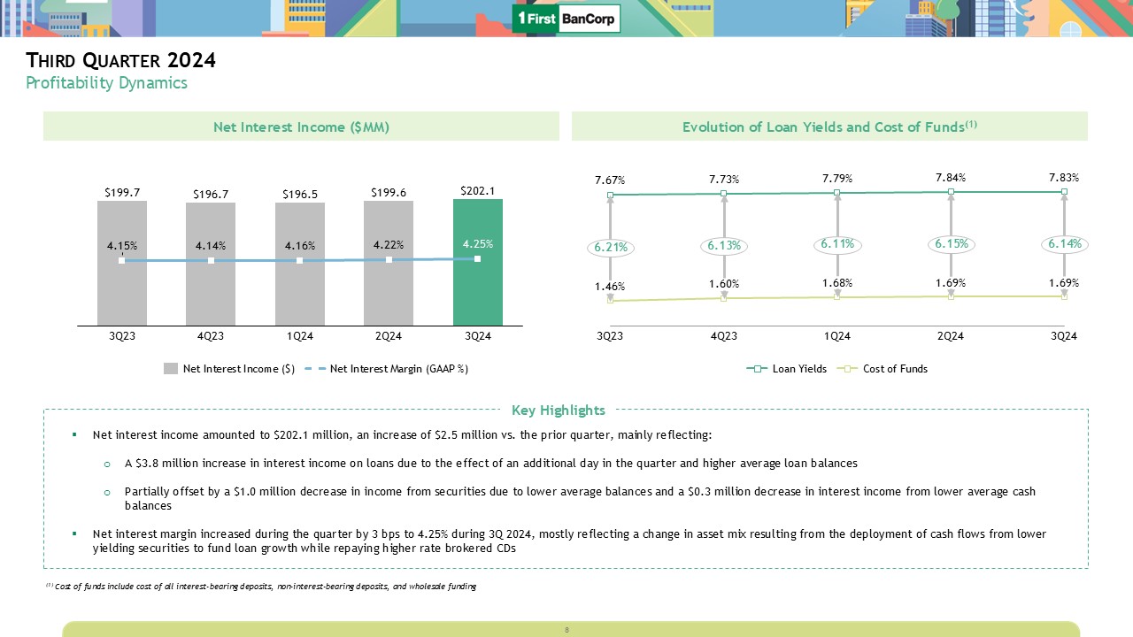 Third Quarter 2024  Profitability Dynamics  Net Interest Income ($MM)  4.15%  3Q23  4.14%  4Q23  4.16%  1Q24  4.22%  2Q24  4.25%  3Q24  Net Interest Income ($)  Net Interest Margin (GAAP %)  Net interest income amounted to $202.1 million, an increase of $2.5 million vs. the prior quarter, mainly reflecting:   A $3.8 million increase in interest income on loans due to the effect of an additional day in the quarter and higher average loan balances  Partially offset by a $1.0 million decrease in income from securities due to lower average balances and a $0.3 million decrease in interest income from lower average cash balances  Net interest margin increased during the quarter by 3 bps to 4.25% during 3Q 2024, mostly reflecting a change in asset mix resulting from the deployment of cash flows from lower yielding securities to fund loan growth while repaying higher rate brokered CDs  Key Highlights  Evolution of Loan Yields and Cost of Funds(1)  (1) Cost of funds include cost of all interest-bearing deposits, non-interest-bearing deposits, and wholesale funding  3Q23  4Q23  1Q24  2Q24  3Q24  6.21%  6.13%  6.11%  6.15%  6.14%  Loan Yields  Cost of Funds  8