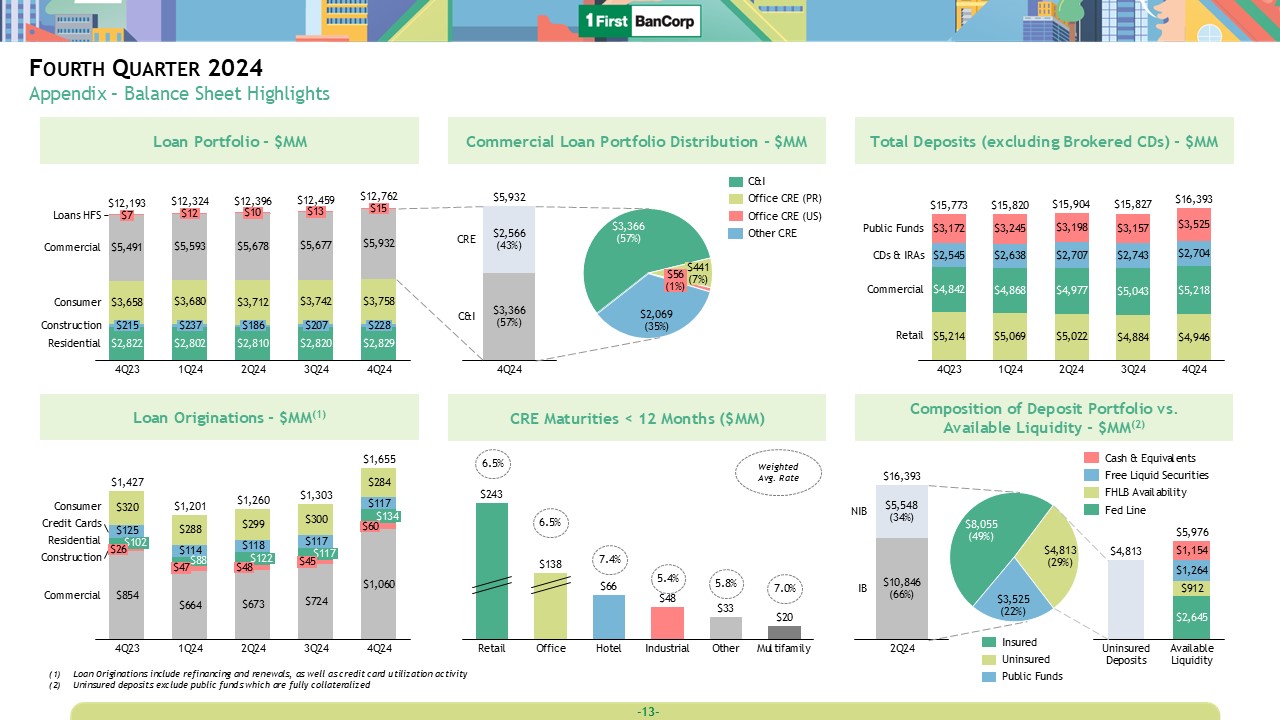 Fourth Quarter 2024  Appendix – Balance Sheet Highlights  Loan Portfolio - $MM  Loan Originations - $MM(1)  Total Deposits (excluding Brokered CDs) - $MM  Composition of Deposit Portfolio vs.   Available Liquidity - $MM(2)  $7  $215  4Q23  $12  $237  1Q24  $10  $186  2Q24  $13  $207  3Q24  $15  $228  4Q24  Loans HFS  Commercial  Consumer  Construction  Residential  $12,193  $12,324  $12,396  $12,459  $12,762  $102  $26  4Q23  $47  1Q24  $122  $48  2Q24  $117  $45  3Q24  $134  $60  4Q24  Consumer  Credit Cards  Residential  Construction  Commercial  $1,427  $1,201  $1,260  $1,303  $1,655  4Q23  1Q24  2Q24  3Q24  4Q24  Public Funds  CDs & IRAs  Commercial  Retail  $15,773  $15,820  $15,904  $15,827  $16,393  Loan Originations include refinancing and renewals, as well as credit card utilization activity  Uninsured deposits exclude public funds which are fully collateralized   $5,548(34%)  $10,846(66%)  2Q24  NIB  IB  $16,393  $8,055(49%)  $4,813(29%)  $3,525(22%)  Insured  Uninsured  Public Funds  Uninsured Deposits  Available Liquidity  $5,976  Cash & Equivalents  Free Liquid Securities  FHLB Availability  Fed Line  Commercial Loan Portfolio Distribution - $MM  $2,566(43%)  $3,366(57%)  4Q24  CRE  C&I  $5,932  $3,366(57%)  $441(7%)  $56(1%)  $2,069(35%)  C&I  Office CRE (PR)  Office CRE (US)  Other CRE  CRE Maturities < 12 Months ($MM)  Retail  Office  Hotel  Industrial  Other  Multifamily  $243  $138  6.5%  6.5%  7.4%  5.4%  5.8%  7.0%  Weighted Avg. Rate