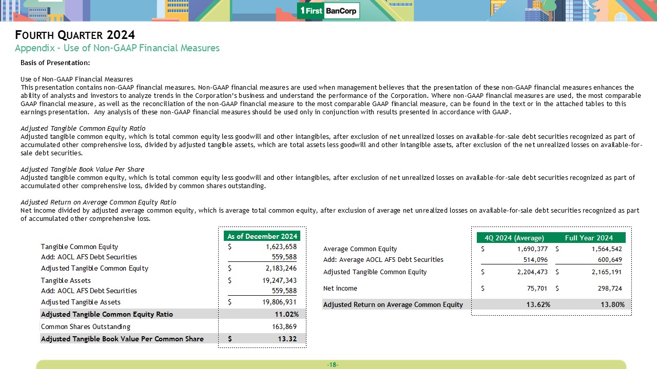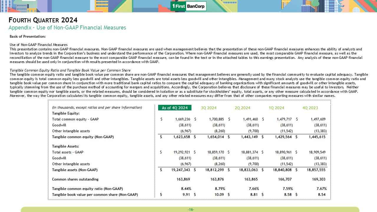 Fourth Quarter 2024  Appendix - Use of Non-GAAP Financial Measures  Basis of Presentation:  Use of Non-GAAP Financial Measures   This presentation contains non-GAAP financial measures. Non-GAAP financial measures are used when management believes that the presentation of these non-GAAP financial measures enhances the ability of analysts and investors to analyze trends in the Corporation’s business and understand the performance of the Corporation. Where non-GAAP financial measures are used, the most comparable GAAP financial measure, as well as the reconciliation of the non-GAAP financial measure to the most comparable GAAP financial measure, can be found in the text or in the attached tables to this earnings presentation. Any analysis of these non-GAAP financial measures should be used only in conjunction with results presented in accordance with GAAP.   Tangible Common Equity Ratio and Tangible Book Value per Common Share   The tangible common equity ratio and tangible book value per common share are non-GAAP financial measures that management believes are generally used by the financial community to evaluate capital adequacy. Tangible common equity is total common equity less goodwill and other intangibles. Tangible assets are total assets less goodwill and other intangibles. Management and many stock analysts use the tangible common equity ratio and tangible book value per common share in conjunction with more traditional bank capital ratios to compare the capital adequacy of banking organizations with significant amounts of goodwill or other intangible assets, typically stemming from the use of the purchase method of accounting for mergers and acquisitions. Accordingly, the Corporation believes that disclosure of these financial measures may be useful to investors. Neither tangible common equity nor tangible assets, or the related measures, should be considered in isolation or as a substitute for stockholders’ equity, total assets, or any other measure calculated in accordance with GAAP. Moreover, the way the Corporation calculates its tangible common equity, tangible assets, and any other related measures may differ from that of other companies reporting measures with similar names.