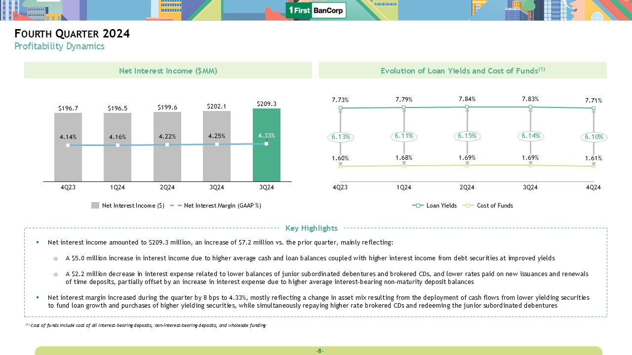 Fourth Quarter 2024  Profitability Dynamics  Net Interest Income ($MM)  4.14%  4Q23  4.16%  1Q24  4.22%  2Q24  4.25%  3Q24  4.33%  3Q24  Net Interest Income ($)  Net Interest Margin (GAAP %)  Net interest income amounted to $209.3 million, an increase of $7.2 million vs. the prior quarter, mainly reflecting:   A $5.0 million increase in interest income due to higher average cash and loan balances coupled with higher interest income from debt securities at improved yields  A $2.2 million decrease in interest expense related to lower balances of junior subordinated debentures and brokered CDs, and lower rates paid on new issuances and renewals of time deposits, partially offset by an increase in interest expense due to higher average interest-bearing non-maturity deposit balances  Net interest margin increased during the quarter by 8 bps to 4.33%, mostly reflecting a change in asset mix resulting from the deployment of cash flows from lower yielding securities to fund loan growth and purchases of higher yielding securities, while simultaneously repaying higher rate brokered CDs and redeeming the junior subordinated debentures  Key Highlights  Evolution of Loan Yields and Cost of Funds(1)  (1) Cost of funds include cost of all interest-bearing deposits, non-interest-bearing deposits, and wholesale funding  4Q23  1Q24  2Q24  3Q24  4Q24  6.13%  6.11%  6.15%  6.14%  6.10%  Loan Yields  Cost of Funds