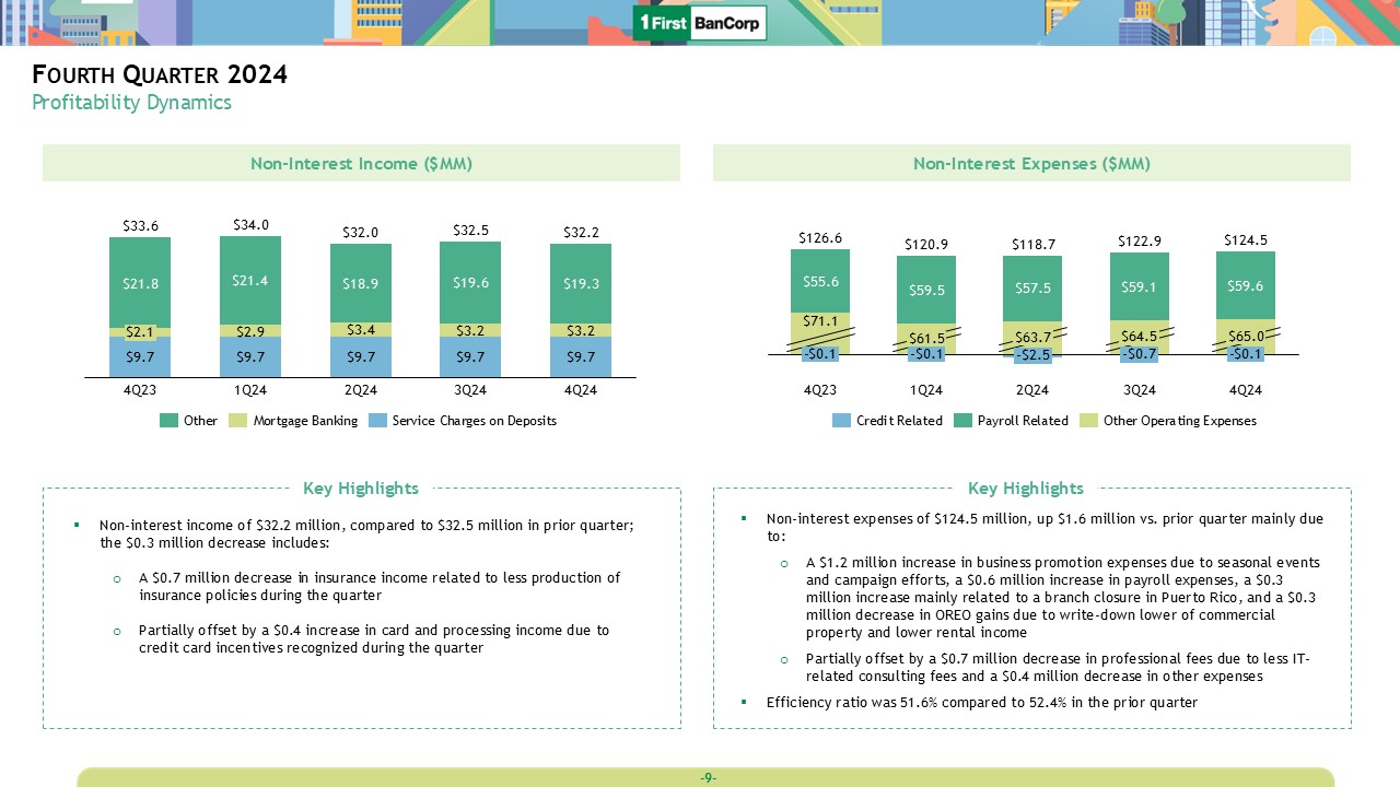 Fourth Quarter 2024  Profitability Dynamics  Non-Interest Expenses ($MM)  Non-Interest Income ($MM)  -20  0  80  100  120  140  -$0.1  $71.1  4Q23  -$0.1  $61.5  1Q24  3Q24  $64.5  $122.9  -$0.7  $124.5  4Q24  2Q24  $65.0  $126.6  $63.7  -$0.1  $120.9  -$2.5  $118.7  Credit Related  Payroll Related  Other Operating Expenses  $2.1  4Q23  1Q24  2Q24  3Q24  4Q24  $33.6  $34.0  $32.0  $32.5  $32.2  Other  Mortgage Banking  Service Charges on Deposits  Non-interest expenses of $124.5 million, up $1.6 million vs. prior quarter mainly due to:  A $1.2 million increase in business promotion expenses due to seasonal events and campaign efforts, a $0.6 million increase in payroll expenses, a $0.3 million increase mainly related to a branch closure in Puerto Rico, and a $0.3 million decrease in OREO gains due to write-down lower of commercial property and lower rental income  Partially offset by a $0.7 million decrease in professional fees due to less IT-related consulting fees and a $0.4 million decrease in other expenses   Efficiency ratio was 51.6% compared to 52.4% in the prior quarter   Key Highlights  Key Highlights  Non-interest income of $32.2 million, compared to $32.5 million in prior quarter; the $0.3 million decrease includes:  A $0.7 million decrease in insurance income related to less production of insurance policies during the quarter  Partially offset by a $0.4 increase in card and processing income due to credit card incentives recognized during the quarter