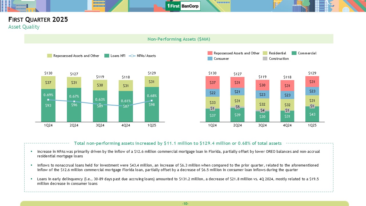 First Quarter 2025  Asset Quality  Non-Performing Assets ($MM)  Increase in NPAs was primarily driven by the inflow of a $12.6 million commercial mortgage loan in Florida, partially offset by lower OREO balances and non-accrual residential mortgage loans  Inflows to nonaccrual loans held for investment were $43.4 million, an increase of $6.3 million when compared to the prior quarter, related to the aforementioned inflow of the $12.6 million commercial mortgage Florida loan, partially offset by a decrease of $6.5 million in consumer loan inflows during the quarter  Loans in early delinquency (i.e., 30-89 days past due accruing loans) amounted to $131.2 million, a decrease of $21.8 million vs. 4Q 2024, mostly related to a $19.5 million decrease in consumer loans  Total non-performing assets increased by $11.1 million to $129.4 million or 0.68% of total assets  0.69%  1Q24  0.67%  2Q24  $89  0.63%  3Q24  $87  0.61%  4Q24  0.68%  1Q25  $130  $127  $119  $118  $129  Repossessed Assets and Other  Loans HFI  NPAs/Assets  $1  1Q24  $5  2Q24  $4  3Q24  $1  4Q24  $1  1Q25  $130  $127  $119  $118  $129  Repossessed Assets and Other  Consumer  Residential  Construction  Commercial