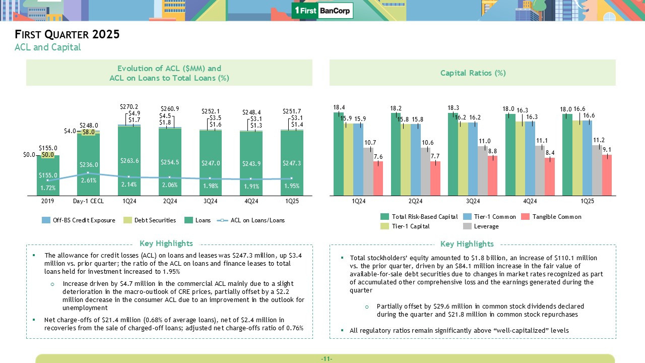 First Quarter 2025  ACL and Capital  Total stockholders’ equity amounted to $1.8 billion, an increase of $110.1 million vs. the prior quarter, driven by an $84.1 million increase in the fair value of available-for-sale debt securities due to changes in market rates recognized as part of accumulated other comprehensive loss and the earnings generated during the quarter  Partially offset by $29.6 million in common stock dividends declared during the quarter and $21.8 million in common stock repurchases  All regulatory ratios remain significantly above “well-capitalized” levels  Evolution of ACL ($MM) and   ACL on Loans to Total Loans (%)  Capital Ratios (%)  The allowance for credit losses (ACL) on loans and leases was $247.3 million, up $3.4 million vs. prior quarter; the ratio of the ACL on loans and finance leases to total loans held for investment increased to 1.95%  Increase driven by $4.7 million in the commercial ACL mainly due to a slight deterioration in the macro-outlook of CRE prices, partially offset by a $2.2 million decrease in the consumer ACL due to an improvement in the outlook for unemployment  Net charge-offs of $21.4 million (0.68% of average loans), net of $2.4 million in recoveries from the sale of charged-off loans; adjusted net charge-offs ratio of 0.76%  Key Highlights  Key Highlights  $0.0  1.72%  2019  $8.0  2.61%  Day-1 CECL  $0.0  2.14%  1Q24  2.06%  4Q24  3Q24  1.98%  2Q24  1.95%  1Q25  $155.0  $248.0  1.91%  $260.9  $252.1  $248.4  $251.7  $270.2  Off-BS Credit Exposure  Debt Securities  Loans  ACL on Loans/Loans  15.9  1Q24  15.8  2Q24  16.2  3Q24  4Q24  1Q25  Total Risk-Based Capital  Tier-1 Capital  Tier-1 Common  Leverage  Tangible Common