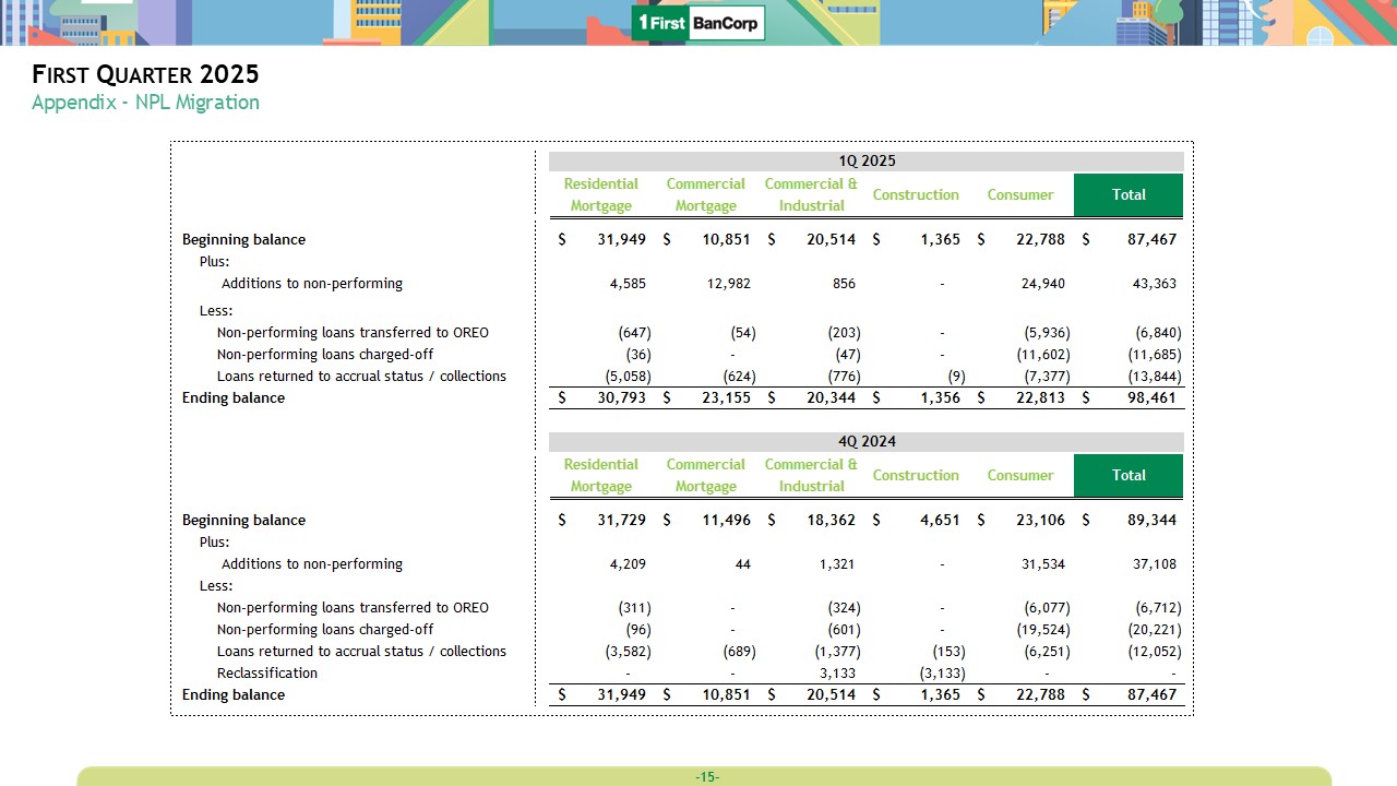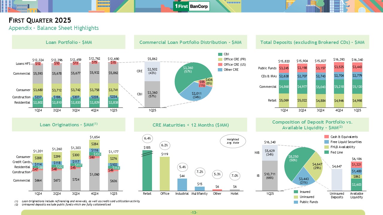 First Quarter 2025  Appendix – Balance Sheet Highlights  Loan Portfolio - $MM  Loan Originations - $MM(1)  Total Deposits (excluding Brokered CDs) - $MM  Composition of Deposit Portfolio vs.   Available Liquidity - $MM(2)  $12  $237  1Q24  $10  $186  2Q24  $13  $207  3Q24  $15  $228  4Q24  $15  $234  1Q25  Loans HFS  Commercial  Consumer  Construction  Residential  $12,324  $12,396  $12,459  $12,762  $12,690  $47  1Q24  $122  $48  2Q24  $117  $45  3Q24  $133  $60  4Q24  $114  $49  1Q25  Consumer  Credit Cards  Residential  Construction  Commercial  $1,201  $1,260  $1,303  $1,654  $1,177  1Q24  2Q24  3Q24  4Q24  1Q25  Public Funds  CDs & IRAs  Commercial  Retail  $15,820  $15,904  $15,827  $16,393  $16,340  Loan Originations include refinancing and renewals, as well as credit card utilization activity  Uninsured deposits exclude public funds which are fully collateralized   $5,629(34%)  $10,711(66%)  1Q25  NIB  IB  $16,340  $8,250(50%)  $4,647(29%)  $3,443(21%)  Insured  Uninsured  Public Funds  Uninsured Deposits  Available Liquidity  $6,186  Cash & Equivalents  Free Liquid Securities  FHLB Availability  Fed Line  Commercial Loan Portfolio Distribution - $MM  $2,502(43%)  $3,360(57%)  1Q25  CRE  C&I  $5,862  $3,360(57%)  $436(8%)  $55(1%)  $2,011(34%)  C&I  Office CRE (PR)  Office CRE (US)  Other CRE  CRE Maturities < 12 Months ($MM)  Retail  Office  Industrial  Multifamily  Other  Hotel  $185  6.4%  6.2%  5.4%  7.2%  5.3%  7.0%  Weighted Avg. Rate