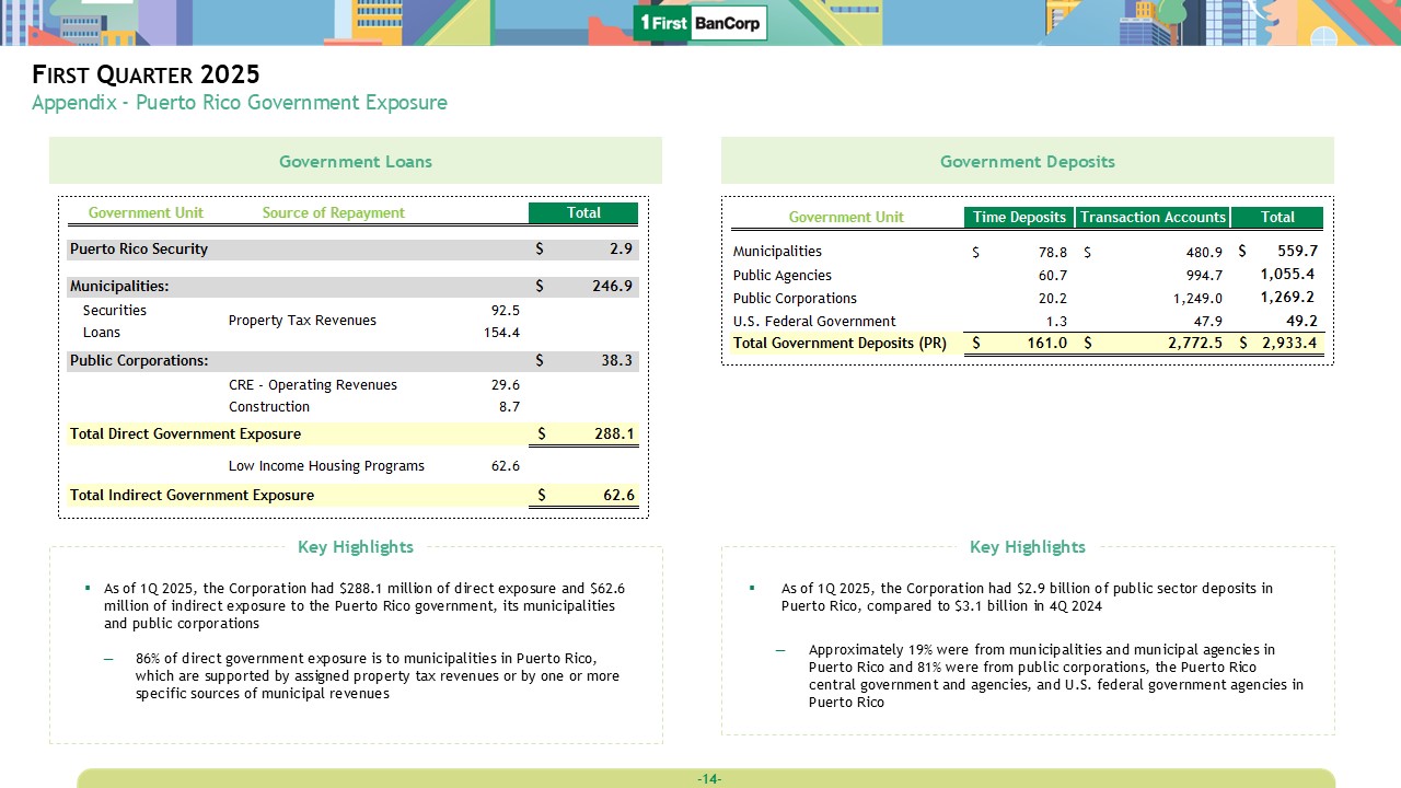 First Quarter 2025  Appendix - Puerto Rico Government Exposure  Government Loans  Key Highlights  Government Deposits  Key Highlights  As of 1Q 2025, the Corporation had $288.1 million of direct exposure and $62.6 million of indirect exposure to the Puerto Rico government, its municipalities and public corporations   86% of direct government exposure is to municipalities in Puerto Rico, which are supported by assigned property tax revenues or by one or more specific sources of municipal revenues  As of 1Q 2025, the Corporation had $2.9 billion of public sector deposits in Puerto Rico, compared to $3.1 billion in 4Q 2024  Approximately 19% were from municipalities and municipal agencies in Puerto Rico and 81% were from public corporations, the Puerto Rico central government and agencies, and U.S. federal government agencies in Puerto Rico