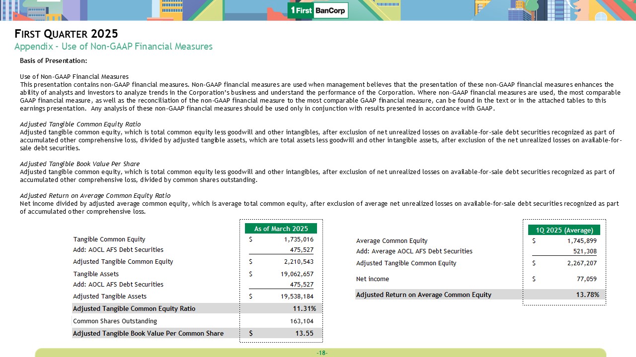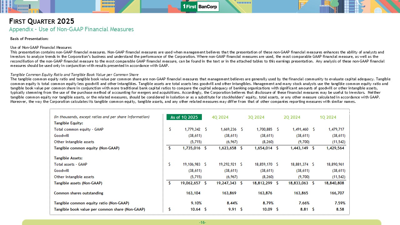 First Quarter 2025  Appendix - Use of Non-GAAP Financial Measures  Basis of Presentation:  Use of Non-GAAP Financial Measures   This presentation contains non-GAAP financial measures. Non-GAAP financial measures are used when management believes that the presentation of these non-GAAP financial measures enhances the ability of analysts and investors to analyze trends in the Corporation’s business and understand the performance of the Corporation. Where non-GAAP financial measures are used, the most comparable GAAP financial measure, as well as the reconciliation of the non-GAAP financial measure to the most comparable GAAP financial measure, can be found in the text or in the attached tables to this earnings presentation. Any analysis of these non-GAAP financial measures should be used only in conjunction with results presented in accordance with GAAP.   Tangible Common Equity Ratio and Tangible Book Value per Common Share   The tangible common equity ratio and tangible book value per common share are non-GAAP financial measures that management believes are generally used by the financial community to evaluate capital adequacy. Tangible common equity is total common equity less goodwill and other intangibles. Tangible assets are total assets less goodwill and other intangibles. Management and many stock analysts use the tangible common equity ratio and tangible book value per common share in conjunction with more traditional bank capital ratios to compare the capital adequacy of banking organizations with significant amounts of goodwill or other intangible assets, typically stemming from the use of the purchase method of accounting for mergers and acquisitions. Accordingly, the Corporation believes that disclosure of these financial measures may be useful to investors. Neither tangible common equity nor tangible assets, or the related measures, should be considered in isolation or as a substitute for stockholders’ equity, total assets, or any other measure calculated in accordance with GAAP. Moreover, the way the Corporation calculates its tangible common equity, tangible assets, and any other related measures may differ from that of other companies reporting measures with similar names.