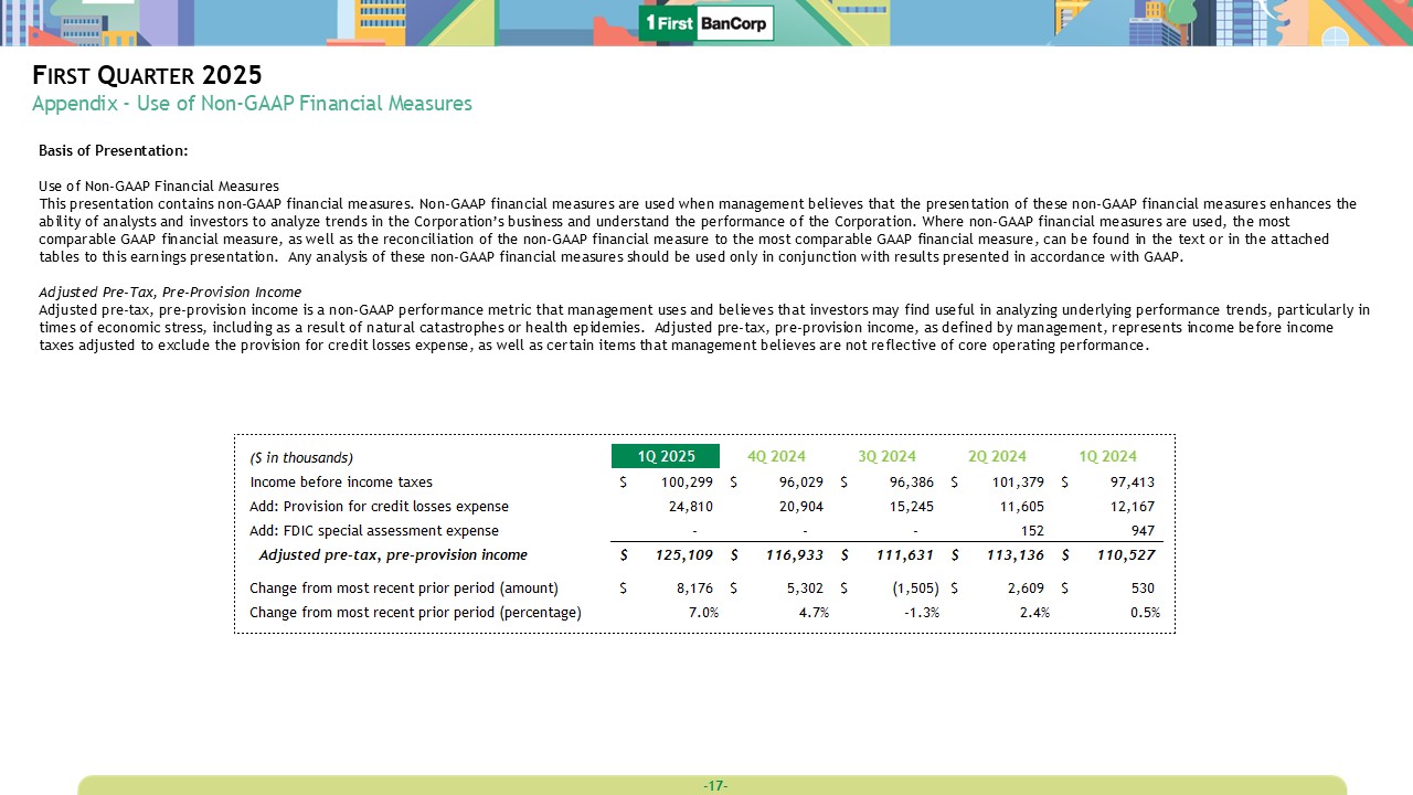 First Quarter 2025  Appendix - Use of Non-GAAP Financial Measures  Basis of Presentation:  Use of Non-GAAP Financial Measures   This presentation contains non-GAAP financial measures. Non-GAAP financial measures are used when management believes that the presentation of these non-GAAP financial measures enhances the ability of analysts and investors to analyze trends in the Corporation’s business and understand the performance of the Corporation. Where non-GAAP financial measures are used, the most comparable GAAP financial measure, as well as the reconciliation of the non-GAAP financial measure to the most comparable GAAP financial measure, can be found in the text or in the attached tables to this earnings presentation. Any analysis of these non-GAAP financial measures should be used only in conjunction with results presented in accordance with GAAP.   Adjusted Pre-Tax, Pre-Provision Income   Adjusted pre-tax, pre-provision income is a non-GAAP performance metric that management uses and believes that investors may find useful in analyzing underlying performance trends, particularly in times of economic stress, including as a result of natural catastrophes or health epidemies. Adjusted pre-tax, pre-provision income, as defined by management, represents income before income taxes adjusted to exclude the provision for credit losses expense, as well as certain items that management believes are not reflective of core operating performance.