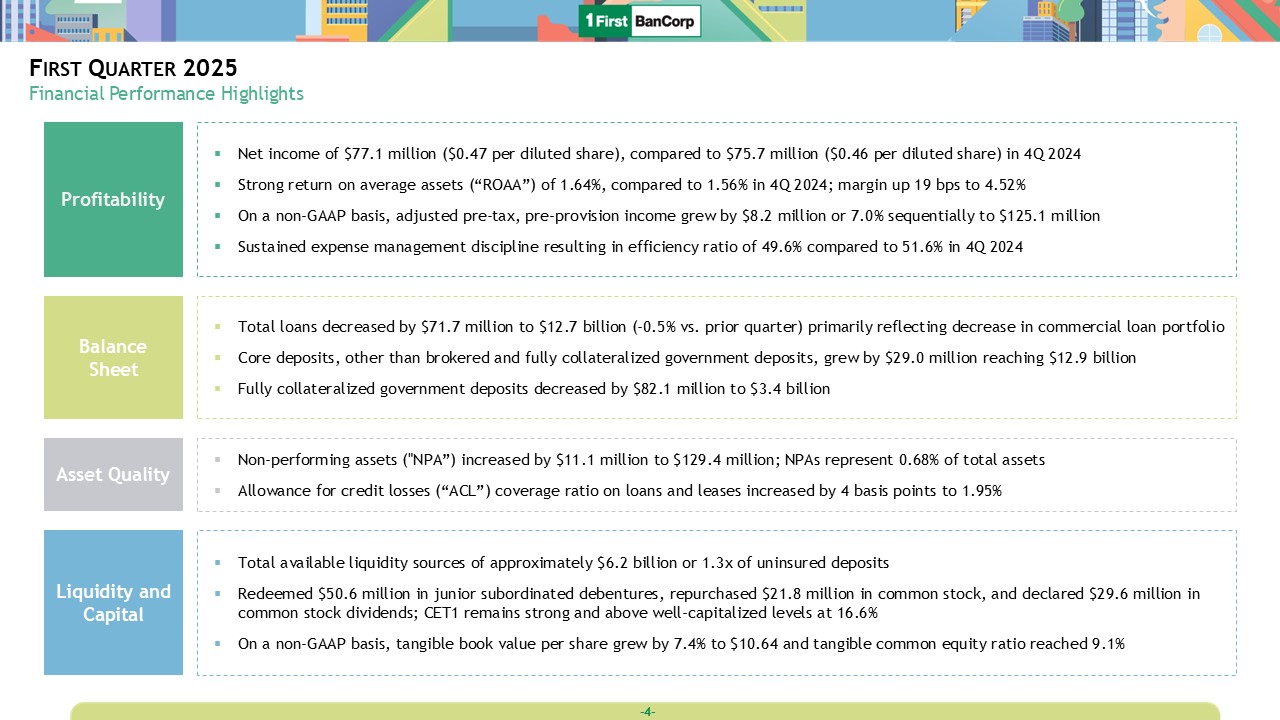 First Quarter 2025  Financial Performance Highlights  Balance Sheet  Total loans decreased by $71.7 million to $12.7 billion (-0.5% vs. prior quarter) primarily reflecting decrease in commercial loan portfolio  Core deposits, other than brokered and fully collateralized government deposits, grew by $29.0 million reaching $12.9 billion  Fully collateralized government deposits decreased by $82.1 million to $3.4 billion  Non-performing assets ("NPA”) increased by $11.1 million to $129.4 million; NPAs represent 0.68% of total assets  Allowance for credit losses (“ACL”) coverage ratio on loans and leases increased by 4 basis points to 1.95%  Asset Quality  Total available liquidity sources of approximately $6.2 billion or 1.3x of uninsured deposits  Redeemed $50.6 million in junior subordinated debentures, repurchased $21.8 million in common stock, and declared $29.6 million in common stock dividends; CET1 remains strong and above well-capitalized levels at 16.6%  On a non-GAAP basis, tangible book value per share grew by 7.4% to $10.64 and tangible common equity ratio reached 9.1%  Liquidity and Capital  Profitability  Net income of $77.1 million ($0.47 per diluted share), compared to $75.7 million ($0.46 per diluted share) in 4Q 2024  Strong return on average assets (“ROAA”) of 1.64%, compared to 1.56% in 4Q 2024; margin up 19 bps to 4.52%  On a non-GAAP basis, adjusted pre-tax, pre-provision income grew by $8.2 million or 7.0% sequentially to $125.1 million  Sustained expense management discipline resulting in efficiency ratio of 49.6% compared to 51.6% in 4Q 2024