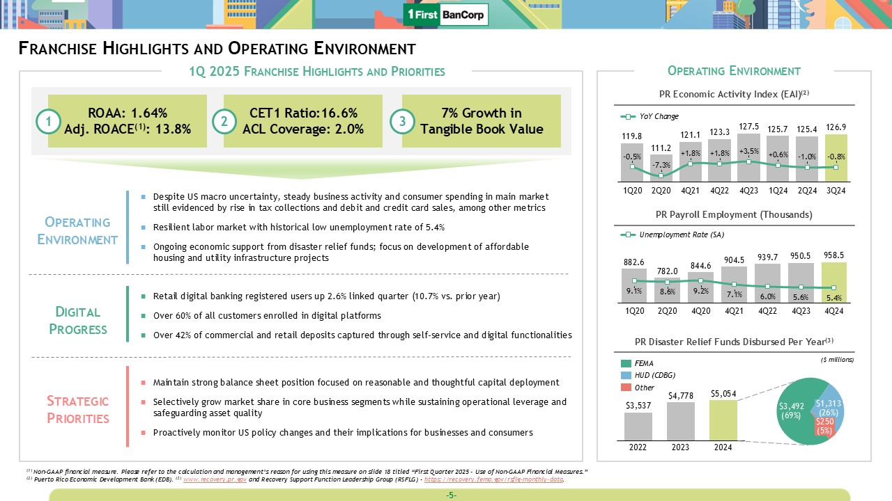 Franchise Highlights and Operating Environment  ROAA: 1.64%   Adj. ROACE(1): 13.8%  1  CET1 Ratio:16.6%  ACL Coverage: 2.0%  2  7% Growth in  Tangible Book Value  3  PR Economic Activity Index (EAI)(2)  1Q20  2Q20  4Q21  4Q22  4Q23  1Q24  2Q24  3Q24  YoY Change  PR Payroll Employment (Thousands)  1Q20  2Q20  4Q20  4Q21  4Q22  4Q23  4Q24  Unemployment Rate (SA)  2022  2023  2024  $3,537  $4,778  $5,054  $3,492(69%)  $1,313(26%)  $250(5%)  FEMA  HUD (CDBG)  Other  PR Disaster Relief Funds Disbursed Per Year(3)  Strategic Priorities  (1) Non-GAAP financial measure. Please refer to the calculation and management’s reason for using this measure on slide 18 titled “First Quarter 2025 - Use of Non-GAAP Financial Measures.”  (2) Puerto Rico Economic Development Bank (EDB). (3) www.recovery.pr.gov and Recovery Support Function Leadership Group (RSFLG) - https://recovery.fema.gov/rsflg-monthly-data.  ($ millions)  1Q 2025 Franchise Highlights and Priorities  Operating Environment  Operating Environment  Despite US macro uncertainty, steady business activity and consumer spending in main market still evidenced by rise in tax collections and debit and credit card sales, among other metrics  Resilient labor market with historical low unemployment rate of 5.4%  Ongoing economic support from disaster relief funds; focus on development of affordable housing and utility infrastructure projects  Digital Progress  Retail digital banking registered users up 2.6% linked quarter (10.7% vs. prior year)  Over 60% of all customers enrolled in digital platforms  Over 42% of commercial and retail deposits captured through self-service and digital functionalities  Maintain strong balance sheet position focused on reasonable and thoughtful capital deployment  Selectively grow market share in core business segments while sustaining operational leverage and safeguarding asset quality   Proactively monitor US policy changes and their implications for businesses and consumers