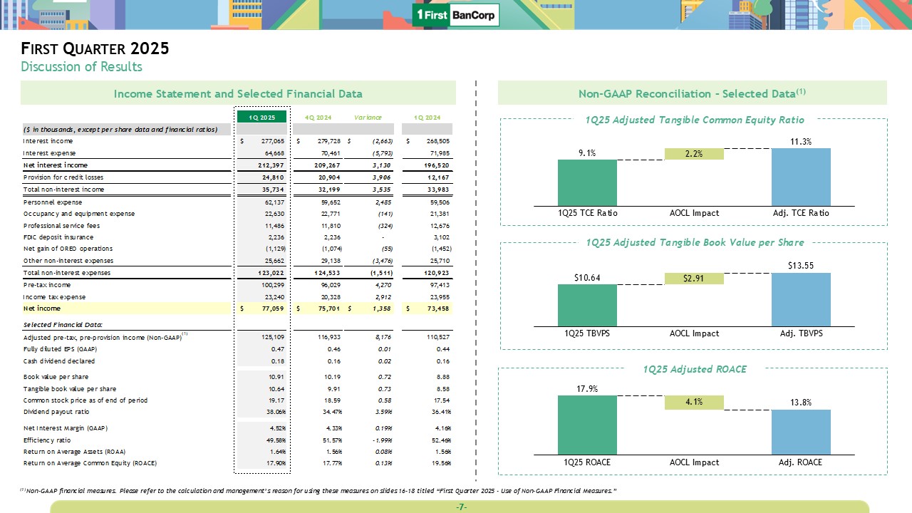 First Quarter 2025  Discussion of Results  1Q25 Adjusted Tangible Common Equity Ratio  1Q25 Adjusted Tangible Book Value per Share  1Q25 Adjusted ROACE  1Q25 TCE Ratio  AOCL Impact  Adj. TCE Ratio  2.2%  1Q25 TBVPS  AOCL Impact  Adj. TBVPS  1Q25 ROACE  4.1%  AOCL Impact  Adj. ROACE  (1) Non-GAAP financial measures. Please refer to the calculation and management’s reason for using these measures on slides 16-18 titled “First Quarter 2025 - Use of Non-GAAP Financial Measures.”  Income Statement and Selected Financial Data  Non-GAAP Reconciliation – Selected Data(1)