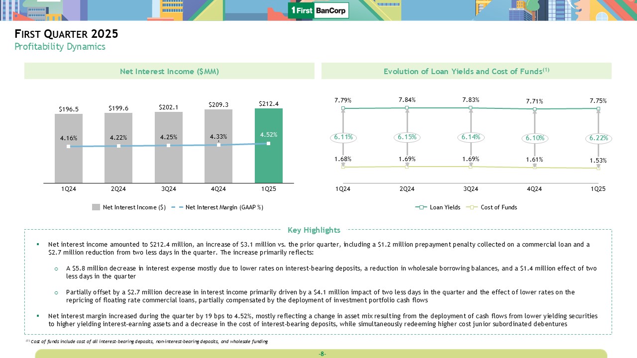 First Quarter 2025  Profitability Dynamics  Net Interest Income ($MM)  4.16%  1Q24  4.22%  2Q24  4.25%  3Q24  4.33%  4Q24  4.52%  1Q25  Net Interest Income ($)  Net Interest Margin (GAAP %)  Net interest income amounted to $212.4 million, an increase of $3.1 million vs. the prior quarter, including a $1.2 million prepayment penalty collected on a commercial loan and a $2.7 million reduction from two less days in the quarter. The increase primarily reflects:  A $5.8 million decrease in interest expense mostly due to lower rates on interest-bearing deposits, a reduction in wholesale borrowing balances, and a $1.4 million effect of two less days in the quarter  Partially offset by a $2.7 million decrease in interest income primarily driven by a $4.1 million impact of two less days in the quarter and the effect of lower rates on the repricing of floating rate commercial loans, partially compensated by the deployment of investment portfolio cash flows   Net interest margin increased during the quarter by 19 bps to 4.52%, mostly reflecting a change in asset mix resulting from the deployment of cash flows from lower yielding securities to higher yielding interest-earning assets and a decrease in the cost of interest-bearing deposits, while simultaneously redeeming higher cost junior subordinated debentures  Key Highlights  Evolution of Loan Yields and Cost of Funds(1)  (1) Cost of funds include cost of all interest-bearing deposits, non-interest-bearing deposits, and wholesale funding  1Q24  2Q24  3Q24  4Q24  1Q25  6.11%  6.15%  6.14%  6.10%  6.22%  Loan Yields  Cost of Funds