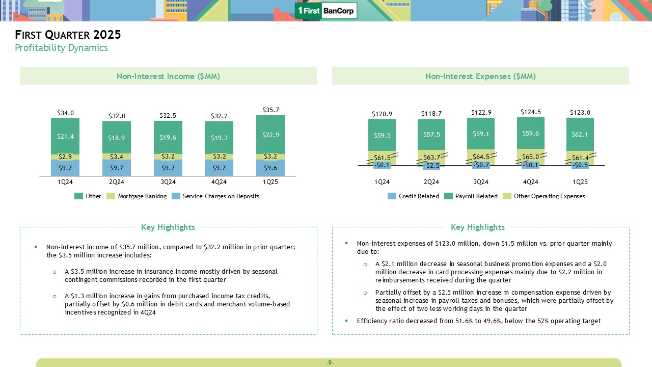 First Quarter 2025  Profitability Dynamics  Non-Interest Expenses ($MM)  Non-interest expenses of $123.0 million, down $1.5 million vs. prior quarter mainly due to:  A $2.1 million decrease in seasonal business promotion expenses and a $2.0 million decrease in card processing expenses mainly due to $2.2 million in reimbursements received during the quarter  Partially offset by a $2.5 million increase in compensation expense driven by seasonal increase in payroll taxes and bonuses, which were partially offset by the effect of two less working days in the quarter  Efficiency ratio decreased from 51.6% to 49.6%, below the 52% operating target  Key Highlights  Non-Interest Income ($MM)  Key Highlights  Non-interest income of $35.7 million, compared to $32.2 million in prior quarter; the $3.5 million increase includes:  A $3.5 million increase in insurance income mostly driven by seasonal contingent commissions recorded in the first quarter  A $1.3 million increase in gains from purchased income tax credits, partially offset by $0.6 million in debit cards and merchant volume-based incentives recognized in 4Q24  -20  0  80  100  120  140  -$0.1  $61.5  1Q24  -$2.5  $63.7  2Q24  4Q24  $65.0  $61.4  -$0.1  -$0.5  $122.9  3Q24  $118.7  $124.5  $64.5  $120.9  1Q25  -$0.7  $123.0  Credit Related  Payroll Related  Other Operating Expenses  1Q24  2Q24  3Q24  4Q24  $34.0  $32.0  $32.5  $32.2  1Q25  $35.7  $2.9  $3.2  $3.2  $3.2  Other  Mortgage Banking  Service Charges on Deposits
