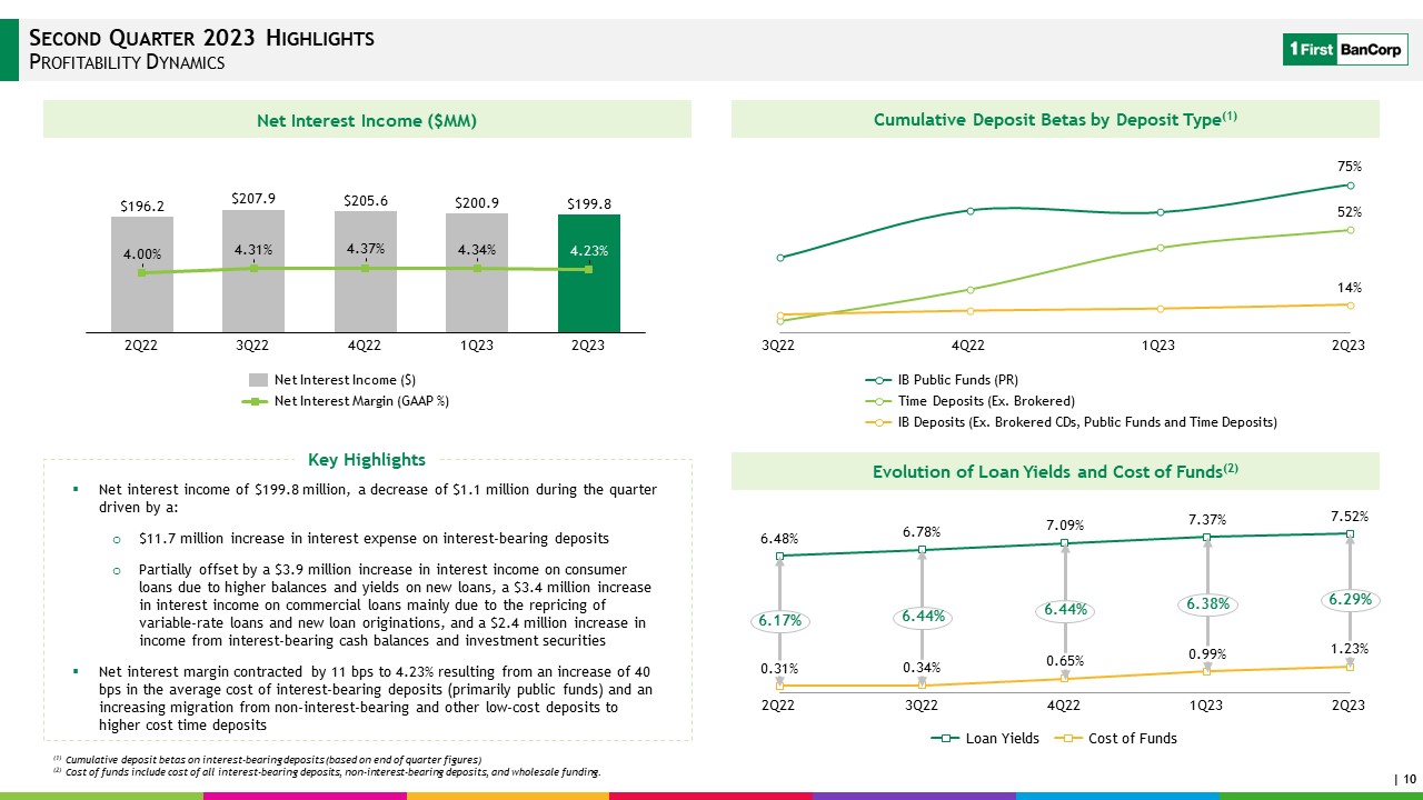 Second Quarter 2023 Highlights Profitability Dynamics  Net Interest Income ($MM)  4.00%  2Q22  4.31%  3Q22  4.37%  4Q22  4.34%  1Q23  4.23%  2Q23  Net Interest Income ($)  Net Interest Margin (GAAP %)  Net interest income of $199.8 million, a decrease of $1.1 million during the quarter driven by a:  $11.7 million increase in interest expense on interest-bearing deposits  Partially offset by a $3.9 million increase in interest income on consumer loans due to higher balances and yields on new loans, a $3.4 million increase in interest income on commercial loans mainly due to the repricing of variable-rate loans and new loan originations, and a $2.4 million increase in income from interest-bearing cash balances and investment securities  Net interest margin contracted by 11 bps to 4.23% resulting from an increase of 40 bps in the average cost of interest-bearing deposits (primarily public funds) and an increasing migration from non-interest-bearing and other low-cost deposits to higher cost time deposits  Key Highlights  Cumulative Deposit Betas by Deposit Type(1)  3Q22  4Q22  1Q23  2Q23  Evolution of Loan Yields and Cost of Funds(2)  2Q22  3Q22  4Q22  1Q23  2Q23  6.29%  6.38%  6.44%  6.44%  6.17%  Loan Yields  Cost of Funds  (1) Cumulative deposit betas on interest-bearing deposits (based on end of quarter figures)  (2) Cost of funds include cost of all interest-bearing deposits, non-interest-bearing deposits, and wholesale funding.  IB Public Funds (PR)  Time Deposits (Ex. Brokered)  IB Deposits (Ex. Brokered CDs, Public Funds and Time Deposits)