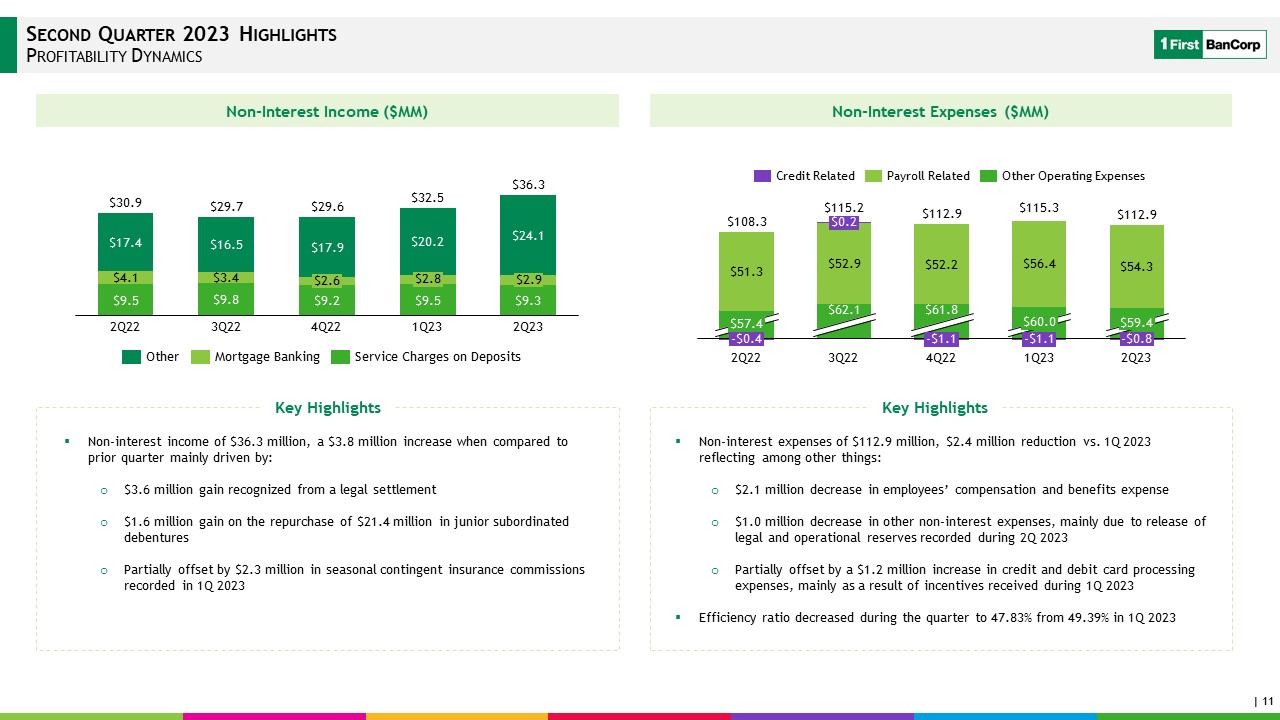 Second Quarter 2023 HighlightsProfitability Dynamics  60  65  70  75  80  85  100  90  105  0  110  95  115  -5  120  -$0.4  $57.4  2Q22  $0.2  $62.1  3Q22  -$1.1  $61.8  4Q22  -$1.1  $60.0  1Q23  -$0.8  $59.4  2Q23  $108.3  $115.2  $112.9  $115.3  $112.9  Credit Related  Payroll Related  Other Operating Expenses  Non-Interest Expenses ($MM)  Non-interest expenses of $112.9 million, $2.4 million reduction vs. 1Q 2023 reflecting among other things:   $2.1 million decrease in employees’ compensation and benefits expense  $1.0 million decrease in other non-interest expenses, mainly due to release of legal and operational reserves recorded during 2Q 2023  Partially offset by a $1.2 million increase in credit and debit card processing expenses, mainly as a result of incentives received during 1Q 2023  Efficiency ratio decreased during the quarter to 47.83% from 49.39% in 1Q 2023  Key Highlights  Non-Interest Income ($MM)  2Q22  3Q22  $2.6  4Q22  $2.8  1Q23  $2.9  2Q23  $30.9  $29.7  $29.6  $32.5  $36.3  Other  Mortgage Banking  Service Charges on Deposits  Key Highlights  Non-interest income of $36.3 million, a $3.8 million increase when compared to prior quarter mainly driven by:  $3.6 million gain recognized from a legal settlement  $1.6 million gain on the repurchase of $21.4 million in junior subordinated debentures  Partially offset by $2.3 million in seasonal contingent insurance commissions recorded in 1Q 2023