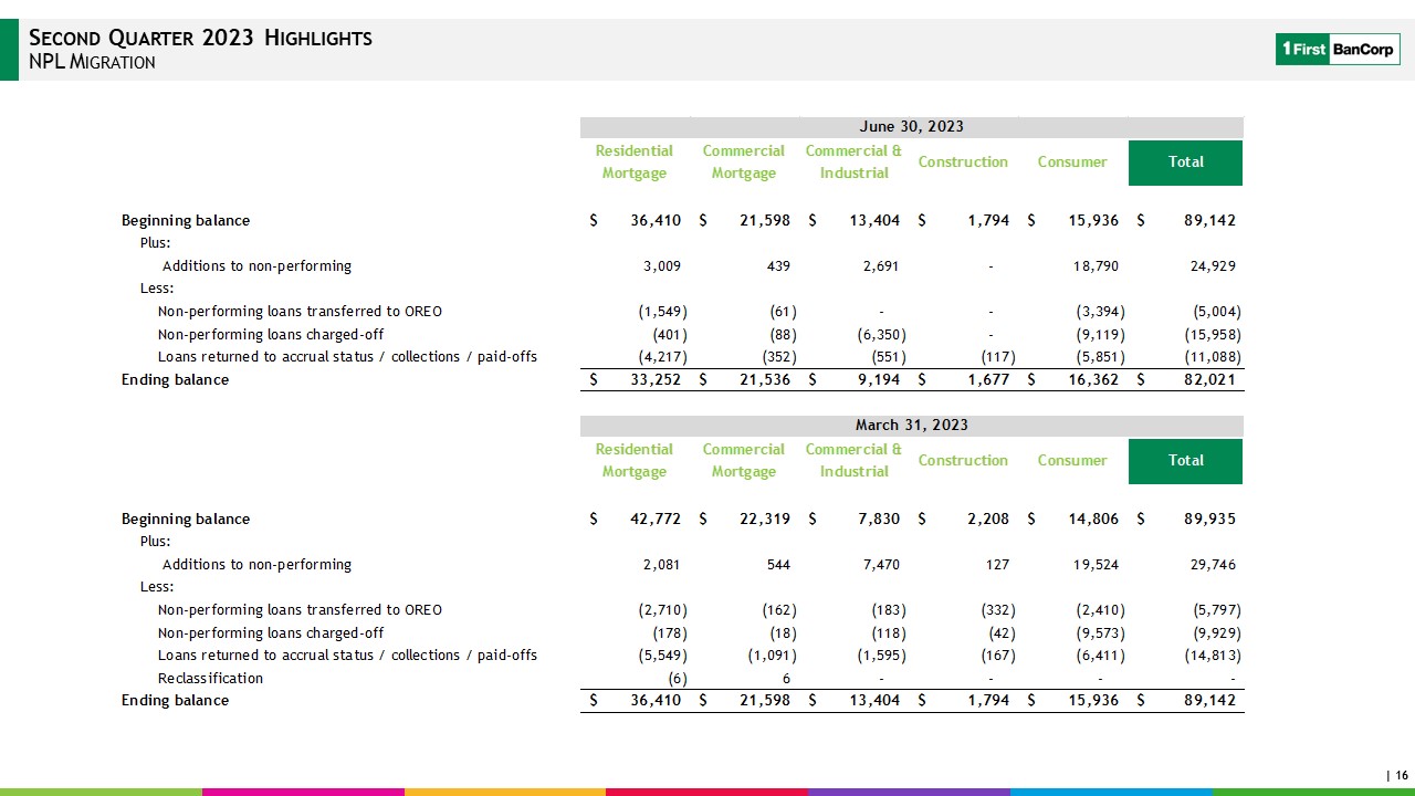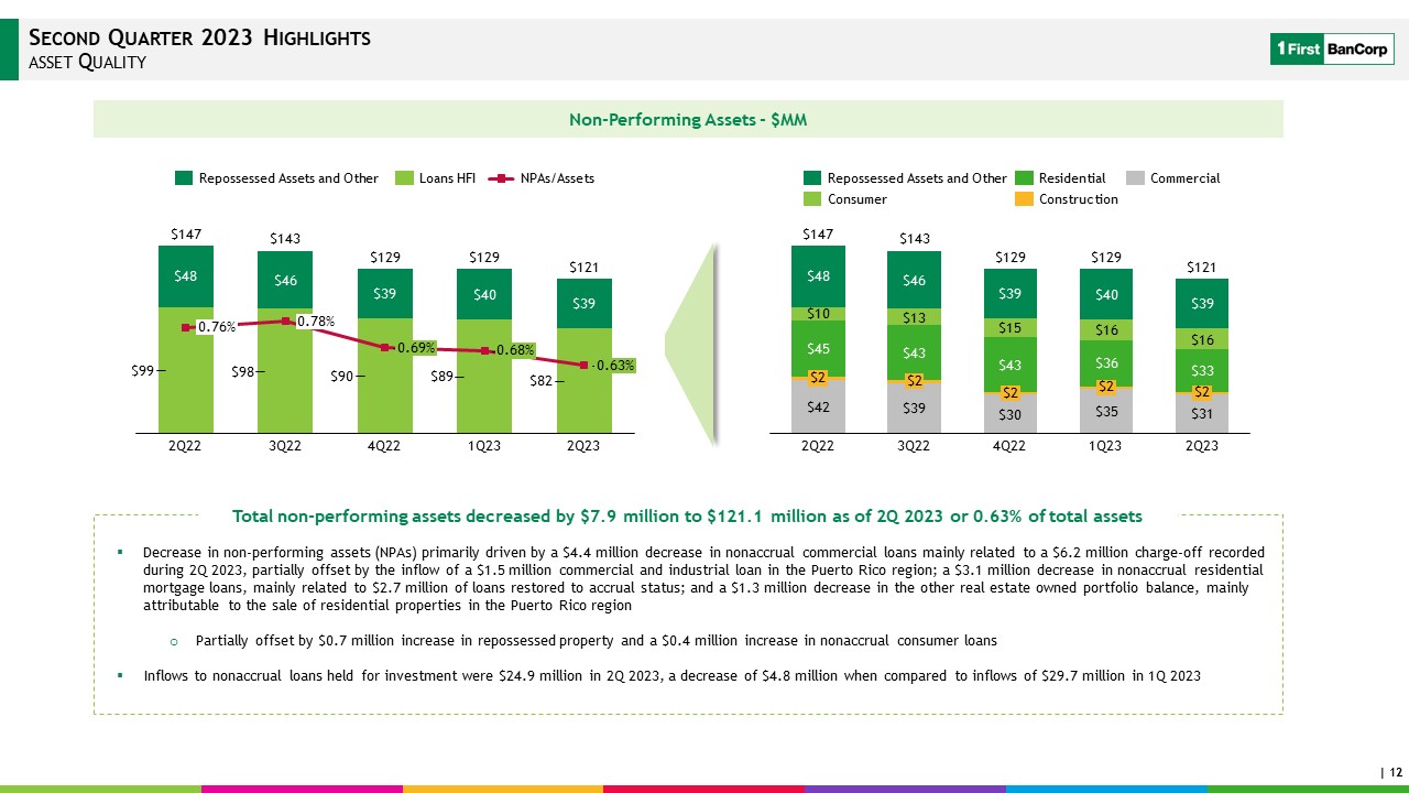 Second Quarter 2023 Highlightsasset Quality  Non-Performing Assets - $MM  0.76%  2Q22  0.78%  3Q22  0.69%  4Q22  0.68%  1Q23  0.63%  2Q23  $147  $143  $129  $129  $121  Repossessed Assets and Other  Loans HFI  NPAs/Assets  $2  2Q22  $2  3Q22  $2  4Q22  $2  1Q23  $2  2Q23  $147  $143  $129  $129  $121  Repossessed Assets and Other  Consumer  Residential  Construction  Commercial  Decrease in non-performing assets (NPAs) primarily driven by a $4.4 million decrease in nonaccrual commercial loans mainly related to a $6.2 million charge-off recorded during 2Q 2023, partially offset by the inflow of a $1.5 million commercial and industrial loan in the Puerto Rico region; a $3.1 million decrease in nonaccrual residential mortgage loans, mainly related to $2.7 million of loans restored to accrual status; and a $1.3 million decrease in the other real estate owned portfolio balance, mainly attributable to the sale of residential properties in the Puerto Rico region  Partially offset by $0.7 million increase in repossessed property and a $0.4 million increase in nonaccrual consumer loans  Inflows to nonaccrual loans held for investment were $24.9 million in 2Q 2023, a decrease of $4.8 million when compared to inflows of $29.7 million in 1Q 2023  Total non-performing assets decreased by $7.9 million to $121.1 million as of 2Q 2023 or 0.63% of total assets