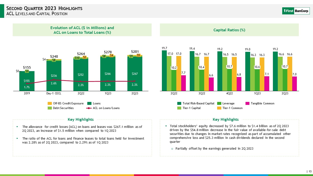 Second Quarter 2023 HighlightsACL Levels and Capital Position  Total stockholders’ equity decreased by $7.6 million to $1.4 billion as of 2Q 2023 driven by the $54.8 million decrease in the fair value of available-for-sale debt securities due to changes in market rates recognized as part of accumulated other comprehensive loss and $25.3 million in cash dividends declared in the second quarter  Partially offset by the earnings generated in 2Q 2023   Evolution of ACL ($ in Millions) and   ACL on Loans to Total Loans (%)  Capital Ratios (%)  $0  $0  1.7%  2019  $8  2.6%  Day-1 CECL  $2  $10  2.3%  2Q22  $4  $8  2.3%  1Q23  $5  $9  2.3%  2Q23  $155  $248  $264  $278  $281  Off-BS Credit Exposure  Debt Securities  Loans  ACL on Loans/Loans  2Q22  3Q22  4Q22  1Q23  2Q23  10.2  10.4  10.7  10.6  10.7  Total Risk-Based Capital  Tier-1 Capital  Leverage  Tier-1 Common  Tangible Common  The allowance for credit losses (ACL) on loans and leases was $267.1 million as of 2Q 2023, an increase of $1.5 million when compared to 1Q 2023  The ratio of the ACL for loans and finance leases to total loans held for investment was 2.28% as of 2Q 2023, compared to 2.29% as of 1Q 2023  Key Highlights  Key Highlights