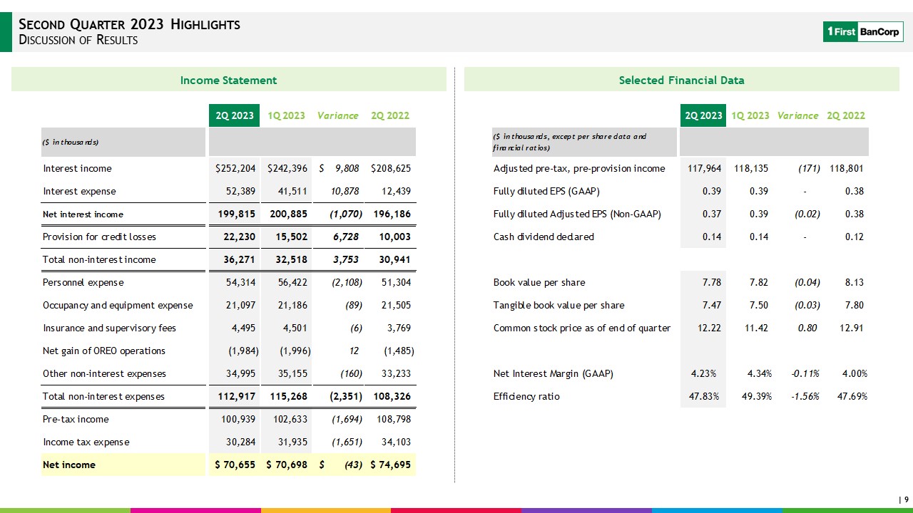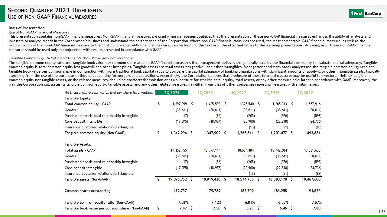 Second Quarter 2023 HighlightsUse of Non-GAAP Financial Measures  Basis of Presentation  Use of Non-GAAP Financial Measures   This presentation contains non-GAAP financial measures. Non-GAAP financial measures are used when management believes that the presentation of these non-GAAP financial measures enhances the ability of analysts and investors to analyze trends in the Corporation’s business and understand the performance of the Corporation. Where non-GAAP financial measures are used, the most comparable GAAP financial measure, as well as the reconciliation of the non-GAAP financial measure to the most comparable GAAP financial measure, can be found in the text or in the attached tables to this earnings presentation. Any analysis of these non-GAAP financial measures should be used only in conjunction with results presented in accordance with GAAP.   Tangible Common Equity Ratio and Tangible Book Value per Common Share   The tangible common equity ratio and tangible book value per common share are non-GAAP financial measures that management believes are generally used by the financial community to evaluate capital adequacy. Tangible common equity is total common equity less goodwill and other intangibles. Tangible assets are total assets less goodwill and other intangibles. Management and many stock analysts use the tangible common equity ratio and tangible book value per common share in conjunction with more traditional bank capital ratios to compare the capital adequacy of banking organizations with significant amounts of goodwill or other intangible assets, typically stemming from the use of the purchase method of accounting for mergers and acquisitions. Accordingly, the Corporation believes that disclosure of these financial measures may be useful to investors. Neither tangible common equity nor tangible assets, or the related measures, should be considered in isolation or as a substitute for stockholders’ equity, total assets, or any other measure calculated in accordance with GAAP. Moreover, the way the Corporation calculates its tangible common equity, tangible assets, and any other related measures may differ from that of other companies reporting measures with similar names.