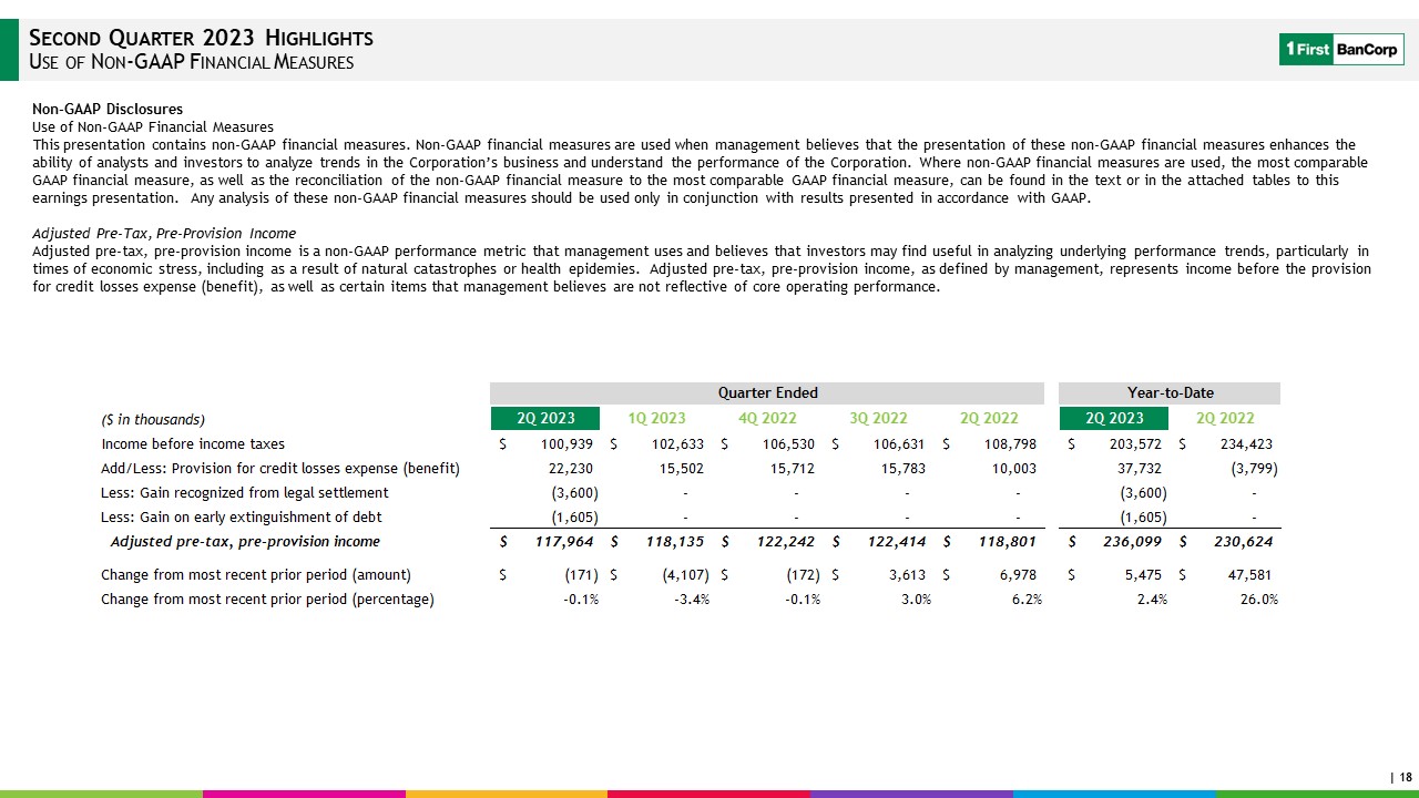 Second Quarter 2023 HighlightsUse of Non-GAAP Financial Measures  Non-GAAP Disclosures  Use of Non-GAAP Financial Measures   This presentation contains non-GAAP financial measures. Non-GAAP financial measures are used when management believes that the presentation of these non-GAAP financial measures enhances the ability of analysts and investors to analyze trends in the Corporation’s business and understand the performance of the Corporation. Where non-GAAP financial measures are used, the most comparable GAAP financial measure, as well as the reconciliation of the non-GAAP financial measure to the most comparable GAAP financial measure, can be found in the text or in the attached tables to this earnings presentation. Any analysis of these non-GAAP financial measures should be used only in conjunction with results presented in accordance with GAAP.   Adjusted Pre-Tax, Pre-Provision Income  Adjusted pre-tax, pre-provision income is a non-GAAP performance metric that management uses and believes that investors may find useful in analyzing underlying performance trends, particularly in times of economic stress, including as a result of natural catastrophes or health epidemies. Adjusted pre-tax, pre-provision income, as defined by management, represents income before the provision for credit losses expense (benefit), as well as certain items that management believes are not reflective of core operating performance.