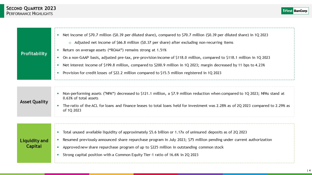 Forward Looking Statements  This presentation contains “forward-looking statements” concerning the Corporation’s future economic, operational and financial performance. The words or phrases “expect,” “anticipate,” “intend,” “should,” “would,” “will,” “plans,” “forecast,” “believe” and similar expressions are meant to identify “forward-looking statements” within the meaning of Section 27A of the Securities Act of 1933, as amended, and Section 21E of the Securities Exchange Act of 1934, as amended, and are subject to the safe harbor created by such sections. The Corporation cautions readers not to place undue reliance on any such forward-looking statements, which speak only as of the date hereof, and advises readers that any such forward-looking statements are not guarantees of future performance and involve certain risks, uncertainties, estimates and assumptions by us that are difficult to predict. Various factors, some of which are beyond our control, including, but not limited to, the uncertainties more fully discussed in Part I, Item 1A, “Risk Factors” of the Corporation’s Annual Report on Form 10-K for the year ended December 31, 2022, Part II Item 1A, “Risk Factors” of the Corporation’s Quarterly Report on Form 10Q for the quarterly period ended March 31, 2023, and the following, could cause actual results to differ materially from those expressed in, or implied by, such forward-looking statements: the impacts of rising interest rates and inflation on the Corporation, including a decrease in demand for new loan originations and refinancings, increased competition for borrowers, attrition in deposits, a reduction in the fair value of the Corporation’s debt securities portfolio, and an increase in non-interest expenses; volatility in the financial services industry, which could result in, among other things, bank deposit runoffs and liquidity constraints; uncertainty as to the ability of FirstBank to retain its core deposits and generate sufficient cash flow through its wholesale funding sources; adverse changes in general economic conditions in Puerto Rico, the U.S., and the U.S. and British Virgin Islands, including in the interest rate environment, unemployment rates, market liquidity, housing absorption rates, real estate markets and U.S. capital markets; general competitive factors, as well as the implementation of strategic growth opportunities and ability to continue to invest in capital projects; uncertainty as to the implementation of the debt restructuring plan of Puerto Rico and the Fiscal Plan for Puerto Rico as certified on April 3,2023 by the Financial Oversight and Management Board for Puerto Rico, or any revisions to it, on our clients and loan portfolios, and any potential impact from future economic or political developments and tax regulations in Puerto Rico; the impact of government financial assistance for hurricane recovery and other disaster relief on economic activity in Puerto Rico; the timing of sales of properties from our other real estate owned (“OREO”) portfolio; any adverse change in the Corporation’s ability to attract and retain clients and gain acceptance from current and prospective customers for new products and services, including those related to the offering of digital banking and financial services; the impacts of applicable legislative, tax or regulatory changes on the Corporation’s financial condition or performance; and the effect of continued changes in the fiscal and monetary policies and regulations of the U.S. federal government and the Puerto Rico and other governments. The Corporation does not undertake, and specifically disclaims any obligation to update any “forward-looking statements” to reflect occurrences or unanticipated events or circumstances after the date of such statements, except as required by the federal securities laws.  Non-GAAP Financial Measures  In addition to the Corporation’s financial information presented in accordance with GAAP, management uses certain “non-GAAP” financial measures” within the meaning of Regulation G promulgated by the SEC, to clarify and enhance understanding of past performance and prospects for the future. Please refer to pages 17-18 for a reconciliation of GAAP to non-GAAP measures and calculations.