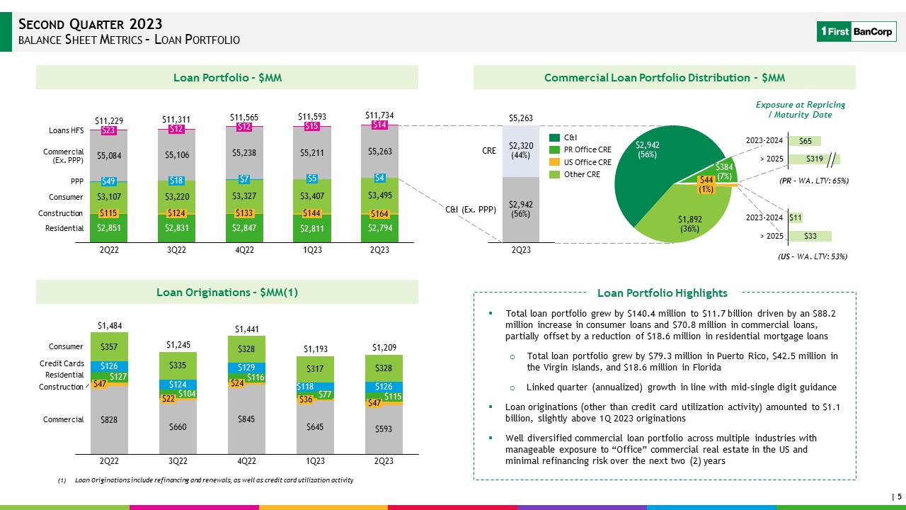Second Quarter 2023balance Sheet Metrics – Loan Portfolio  Loan Portfolio - $MM  Loan Originations - $MM(1)  $23  $49  $115  2Q22  $12  $18  $124  3Q22  $12  $7  $133  4Q22  $15  $5  $144  1Q23  $14  $4  $164  2Q23  Loans HFS  Commercial (Ex. PPP)  PPP  Consumer  Construction  Residential  $11,229  $11,311  $11,565  $11,593  $11,734  $47  2Q22  $22  3Q22  $24  4Q22  $77  $36  1Q23  $47  2Q23  Consumer  Credit Cards  Residential  Construction  Commercial  $1,484  $1,245  $1,441  $1,193  $1,209  Loan Originations include refinancing and renewals, as well as credit card utilization activity   Commercial Loan Portfolio Distribution - $MM  $2,320(44%)  $2,942(56%)  2Q23  CRE  C&I (Ex. PPP)  $5,263  $2,942(56%)  $384(7%)  $44(1%)  $1,892(36%)  C&I  PR Office CRE  US Office CRE  Other CRE  2023-2024  $319  > 2025  Total loan portfolio grew by $140.4 million to $11.7 billion driven by an $88.2 million increase in consumer loans and $70.8 million in commercial loans, partially offset by a reduction of $18.6 million in residential mortgage loans  Total loan portfolio grew by $79.3 million in Puerto Rico, $42.5 million in the Virgin Islands, and $18.6 million in Florida  Linked quarter (annualized) growth in line with mid-single digit guidance  Loan originations (other than credit card utilization activity) amounted to $1.1 billion, slightly above 1Q 2023 originations   Well diversified commercial loan portfolio across multiple industries with manageable exposure to “Office” commercial real estate in the US and minimal refinancing risk over the next two (2) years  Loan Portfolio Highlights  Exposure at Repricing / Maturity Date  2023-2024  > 2025  (US – WA. LTV: 53%)  (PR – WA. LTV: 65%)