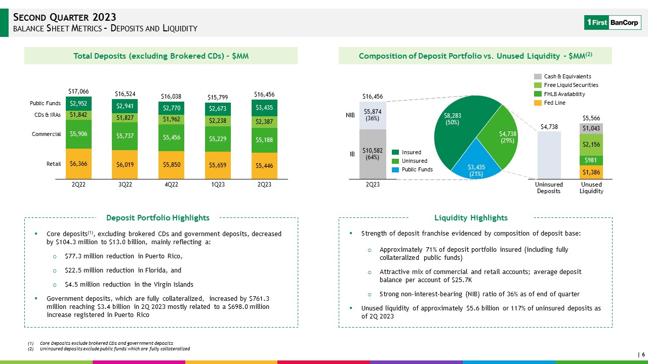 Second Quarter 2023balance Sheet Metrics – Deposits and Liquidity  Core Deposits exclude brokered CDs and government deposits  Uninsured deposits exclude public funds which are fully collateralized  Total Deposits (excluding Brokered CDs) - $MM  2Q22  3Q22  4Q22  1Q23  2Q23  Public Funds  CDs & IRAs  Commercial  Retail  $17,066  $16,524  $16,038  $15,799  $16,456  Core deposits(1), excluding brokered CDs and government deposits, decreased by $104.3 million to $13.0 billion, mainly reflecting a:   $77.3 million reduction in Puerto Rico,   $22.5 million reduction in Florida, and  $4.5 million reduction in the Virgin Islands  Government deposits, which are fully collateralized, increased by $761.3 million reaching $3.4 billion in 2Q 2023 mostly related to a $698.0 million increase registered in Puerto Rico  Deposit Portfolio Highlights  Composition of Deposit Portfolio vs. Unused Liquidity - $MM(2)  $5,874(36%)  $10,582(64%)  2Q23  NIB  IB  $16,456  $8,283(50%)  $4,738(29%)  $3,435(21%)  Insured  Uninsured  Public Funds  Uninsured Deposits  Unused Liquidity  $5,566  Cash & Equivalents  Free Liquid Securities  FHLB Availability  Fed Line  Strength of deposit franchise evidenced by composition of deposit base:  Approximately 71% of deposit portfolio insured (including fully collateralized public funds)  Attractive mix of commercial and retail accounts; average deposit balance per account of $25.7K  Strong non-interest-bearing (NIB) ratio of 36% as of end of quarter  Unused liquidity of approximately $5.6 billion or 117% of uninsured deposits as of 2Q 2023  Liquidity Highlights