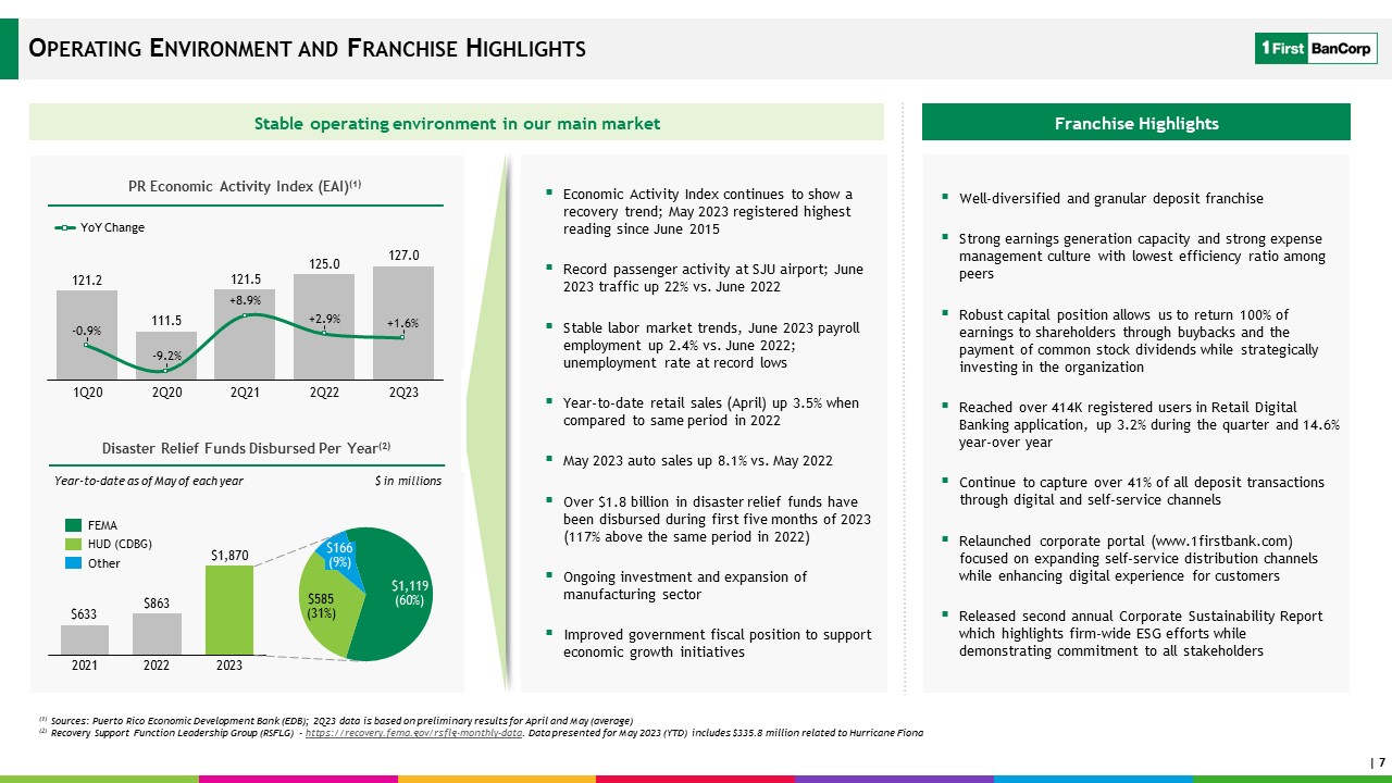 Operating Environment and Franchise Highlights  Stable operating environment in our main market  1Q20  2Q20  2Q21  2Q22  2Q23  -9.2%  YoY Change  PR Economic Activity Index (EAI)(1)  Disaster Relief Funds Disbursed Per Year(2)  (1) Sources: Puerto Rico Economic Development Bank (EDB); 2Q23 data is based on preliminary results for April and May (average)  (2) Recovery Support Function Leadership Group (RSFLG) - https://recovery.fema.gov/rsflg-monthly-data. Data presented for May 2023 (YTD) includes $335.8 million related to Hurricane Fiona  Well-diversified and granular deposit franchise   Strong earnings generation capacity and strong expense management culture with lowest efficiency ratio among peers  Robust capital position allows us to return 100% of earnings to shareholders through buybacks and the payment of common stock dividends while strategically investing in the organization  Reached over 414K registered users in Retail Digital Banking application, up 3.2% during the quarter and 14.6% year-over year  Continue to capture over 41% of all deposit transactions through digital and self-service channels  Relaunched corporate portal (www.1firstbank.com) focused on expanding self-service distribution channels while enhancing digital experience for customers   Released second annual Corporate Sustainability Report which highlights firm-wide ESG efforts while demonstrating commitment to all stakeholders  2021  2022  2023  $633  $863  $1,870  $1,119(60%)  $585(31%)  $166(9%)  FEMA  HUD (CDBG)  Other  $ in millions  Franchise Highlights  Year-to-date as of May of each year  Economic Activity Index continues to show a recovery trend; May 2023 registered highest reading since June 2015   Record passenger activity at SJU airport; June 2023 traffic up 22% vs. June 2022  Stable labor market trends, June 2023 payroll employment up 2.4% vs. June 2022; unemployment rate at record lows  Year-to-date retail sales (April) up 3.5% when compared to same period in 2022  May 2023 auto sales up 8.1% vs. May 2022  Over $1.8 billion in disaster relief funds have been disbursed during first five months of 2023 (117% above the same period in 2022)  Ongoing investment and expansion of manufacturing sector  Improved government fiscal position to support economic growth initiatives