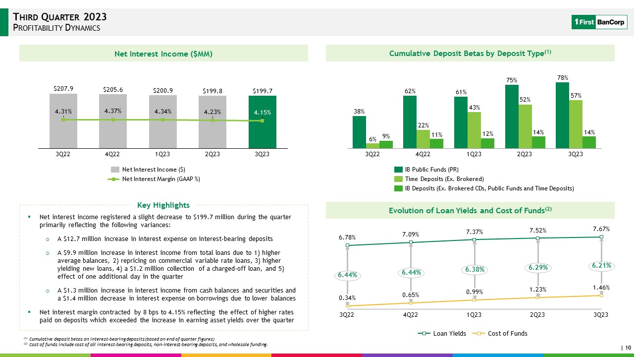 Third Quarter 2023 Profitability Dynamics  Net Interest Income ($MM)  4.31%  3Q22  4.37%  4Q22  4.34%  1Q23  4.23%  2Q23  4.15%  3Q23  Net Interest Income ($)  Net Interest Margin (GAAP %)  Net interest income registered a slight decrease to $199.7 million during the quarter primarily reflecting the following variances:  A $12.7 million increase in interest expense on interest-bearing deposits  A $9.9 million increase in interest income from total loans due to 1) higher average balances, 2) repricing on commercial variable rate loans, 3) higher yielding new loans, 4) a $1.2 million collection of a charged-off loan, and 5) effect of one additional day in the quarter  A $1.3 million increase in interest income from cash balances and securities and a $1.4 million decrease in interest expense on borrowings due to lower balances  Net interest margin contracted by 8 bps to 4.15% reflecting the effect of higher rates paid on deposits which exceeded the increase in earning asset yields over the quarter  Key Highlights  Cumulative Deposit Betas by Deposit Type(1)  3Q22  4Q22  1Q23  2Q23  3Q23  Evolution of Loan Yields and Cost of Funds(2)  (1) Cumulative deposit betas on interest-bearing deposits (based on end of quarter figures)  (2) Cost of funds include cost of all interest-bearing deposits, non-interest-bearing deposits, and wholesale funding.  IB Public Funds (PR)  Time Deposits (Ex. Brokered)  IB Deposits (Ex. Brokered CDs, Public Funds and Time Deposits)  3Q22  4Q22  1Q23  2Q23  3Q23  6.21%  6.29%  6.38%  6.44%  6.44%  Loan Yields  Cost of Funds