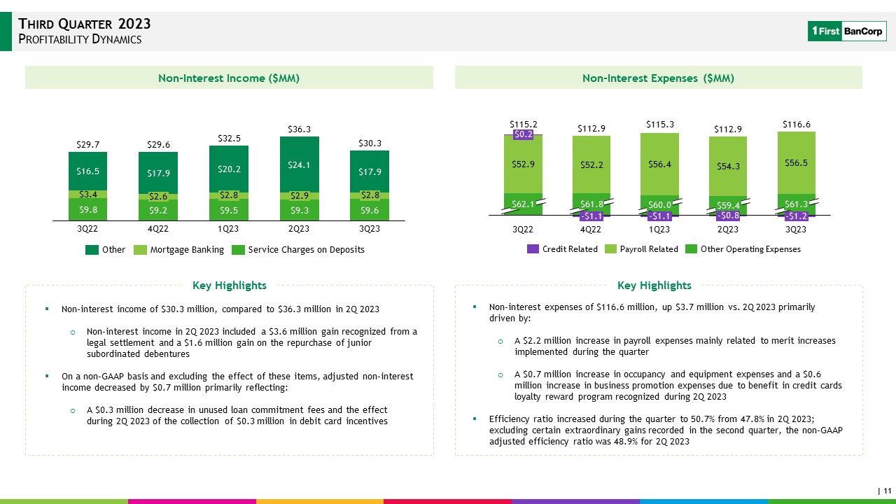 Third Quarter 2023Profitability Dynamics  85  90  95  -5  100  0  105  60  110  65  115  70  120  75  80  3Q23  $116.6  $61.3  3Q22  $60.0  1Q23  $62.1  -$0.8  $59.4  $0.2  2Q23  $61.8  $115.2  $112.9  $115.3  $112.9  4Q22  -$1.1  -$1.1  -$1.2  Credit Related  Payroll Related  Other Operating Expenses  Non-Interest Expenses ($MM)  Non-interest expenses of $116.6 million, up $3.7 million vs. 2Q 2023 primarily driven by:  A $2.2 million increase in payroll expenses mainly related to merit increases implemented during the quarter  A $0.7 million increase in occupancy and equipment expenses and a $0.6 million increase in business promotion expenses due to benefit in credit cards loyalty reward program recognized during 2Q 2023  Efficiency ratio increased during the quarter to 50.7% from 47.8% in 2Q 2023; excluding certain extraordinary gains recorded in the second quarter, the non-GAAP adjusted efficiency ratio was 48.9% for 2Q 2023  Key Highlights  Non-Interest Income ($MM)  3Q22  $2.6  4Q22  $2.8  1Q23  $2.9  2Q23  $29.7  $29.6  $32.5  $36.3  3Q23  $30.3  $2.8  Other  Mortgage Banking  Service Charges on Deposits  Key Highlights  Non-interest income of $30.3 million, compared to $36.3 million in 2Q 2023  Non-interest income in 2Q 2023 included a $3.6 million gain recognized from a legal settlement and a $1.6 million gain on the repurchase of junior subordinated debentures  On a non-GAAP basis and excluding the effect of these items, adjusted non-interest income decreased by $0.7 million primarily reflecting:  A $0.3 million decrease in unused loan commitment fees and the effect during 2Q 2023 of the collection of $0.3 million in debit card incentives