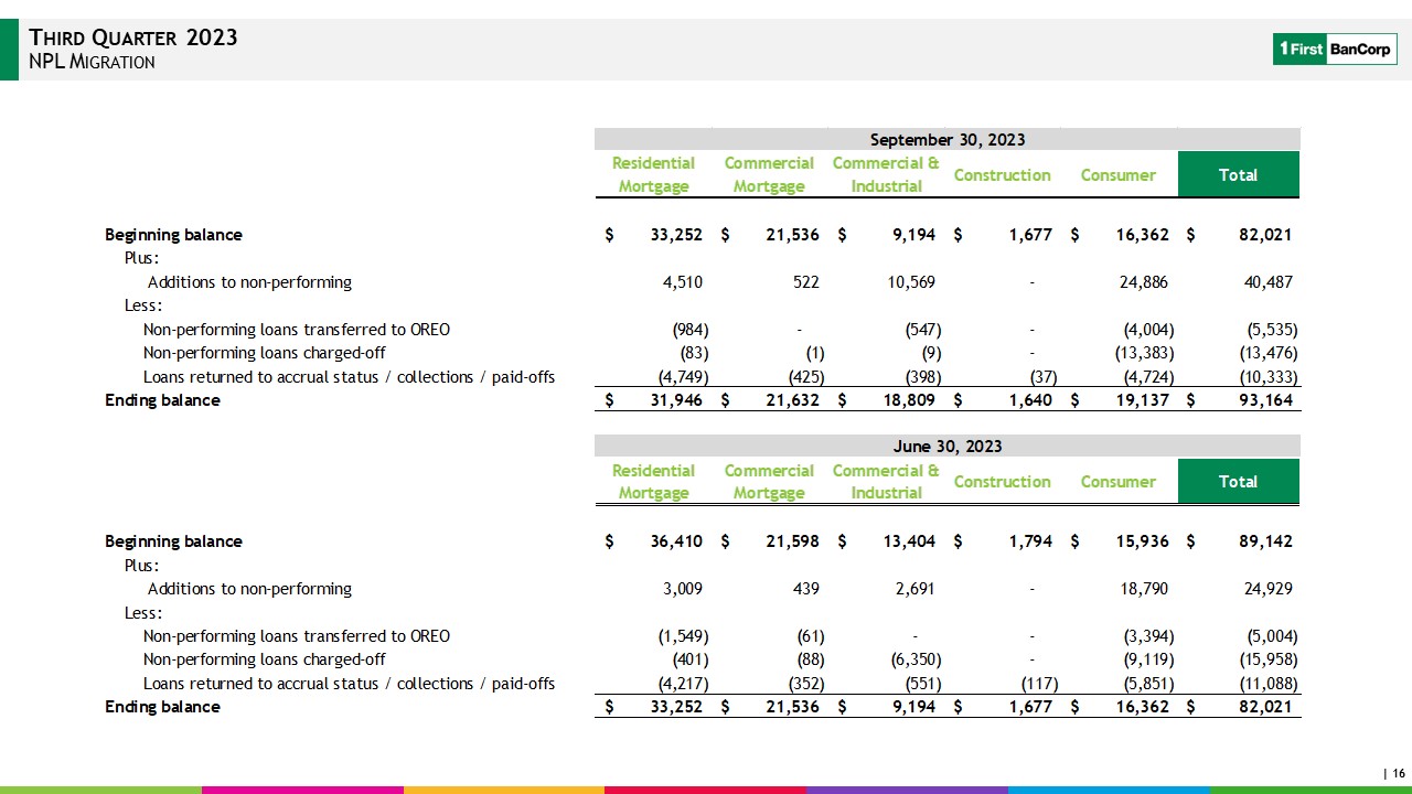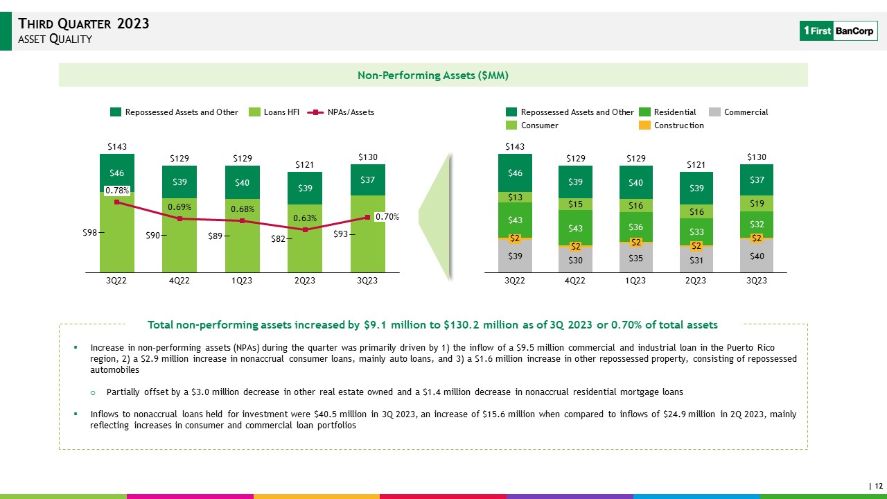 Third Quarter 2023 asset Quality  Non-Performing Assets ($MM)  0.78%  3Q22  0.69%  4Q22  0.68%  1Q23  0.63%  2Q23  $143  $129  $129  $121  3Q23  0.70%  $130  Repossessed Assets and Other  Loans HFI  NPAs/Assets  $2  3Q22  $2  4Q22  $2  1Q23  $2  2Q23  $143  $129  $129  $121  3Q23  $130  $2  Repossessed Assets and Other  Consumer  Residential  Construction  Commercial  Increase in non-performing assets (NPAs) during the quarter was primarily driven by 1) the inflow of a $9.5 million commercial and industrial loan in the Puerto Rico region, 2) a $2.9 million increase in nonaccrual consumer loans, mainly auto loans, and 3) a $1.6 million increase in other repossessed property, consisting of repossessed automobiles  Partially offset by a $3.0 million decrease in other real estate owned and a $1.4 million decrease in nonaccrual residential mortgage loans  Inflows to nonaccrual loans held for investment were $40.5 million in 3Q 2023, an increase of $15.6 million when compared to inflows of $24.9 million in 2Q 2023, mainly reflecting increases in consumer and commercial loan portfolios  Total non-performing assets increased by $9.1 million to $130.2 million as of 3Q 2023 or 0.70% of total assets