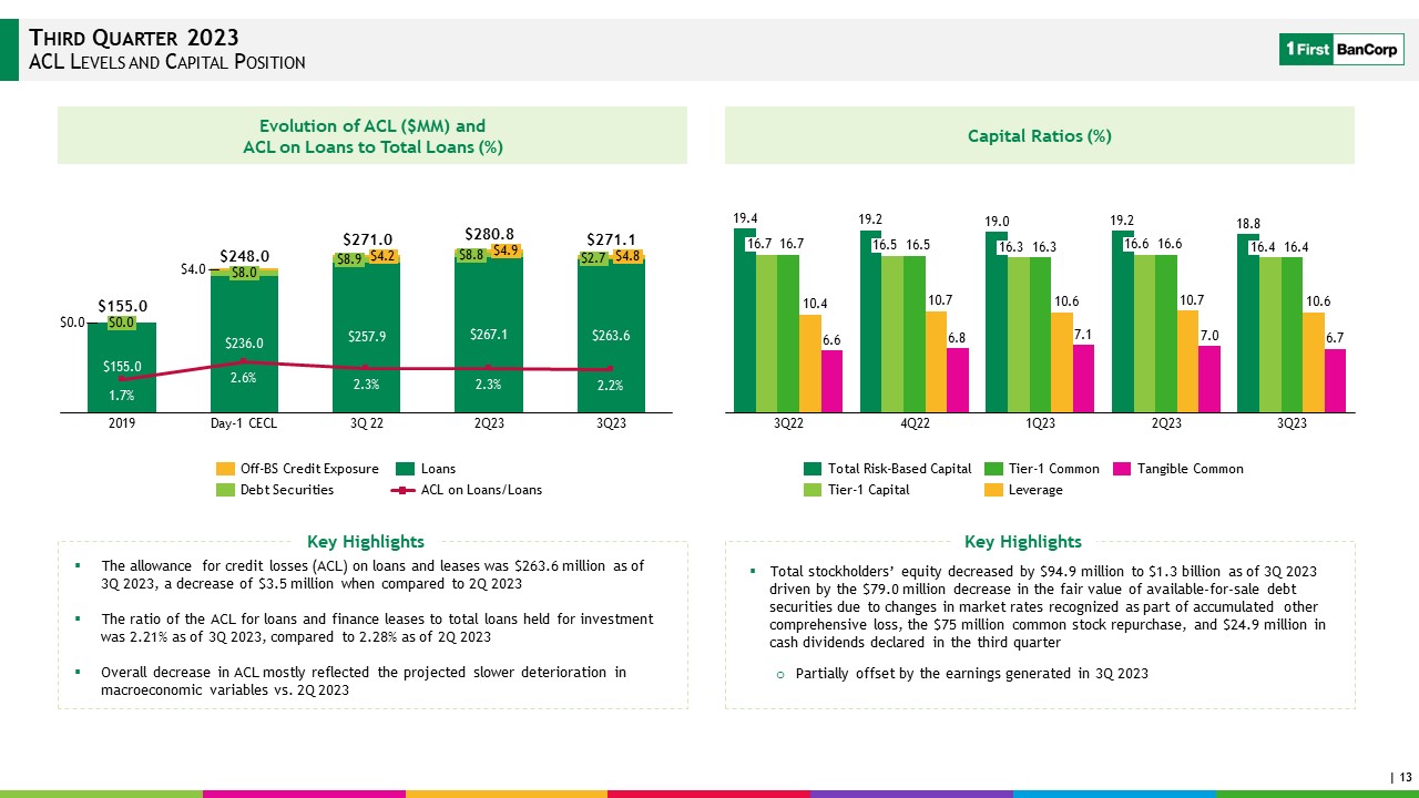 Third Quarter 2023 ACL Levels and Capital Position  Total stockholders’ equity decreased by $94.9 million to $1.3 billion as of 3Q 2023 driven by the $79.0 million decrease in the fair value of available-for-sale debt securities due to changes in market rates recognized as part of accumulated other comprehensive loss, the $75 million common stock repurchase, and $24.9 million in cash dividends declared in the third quarter  Partially offset by the earnings generated in 3Q 2023   Evolution of ACL ($MM) and   ACL on Loans to Total Loans (%)  Capital Ratios (%)  $0.0  $0.0  1.7%  2019  $8.0  2.6%  Day-1 CECL  $4.2  $8.9  2.3%  3Q 22  $4.9  $8.8  2.3%  2Q23  $4.8  $2.7  2.2%  3Q23  $155.0  $248.0  $271.0  $280.8  $271.1  Off-BS Credit Exposure  Debt Securities  Loans  ACL on Loans/Loans  3Q22  4Q22  1Q23  2Q23  3Q23  16.7  16.5  16.3  16.6  16.4  Total Risk-Based Capital  Tier-1 Capital  Tier-1 Common  Leverage  Tangible Common  The allowance for credit losses (ACL) on loans and leases was $263.6 million as of 3Q 2023, a decrease of $3.5 million when compared to 2Q 2023  The ratio of the ACL for loans and finance leases to total loans held for investment was 2.21% as of 3Q 2023, compared to 2.28% as of 2Q 2023  Overall decrease in ACL mostly reflected the projected slower deterioration in macroeconomic variables vs. 2Q 2023  Key Highlights  Key Highlights